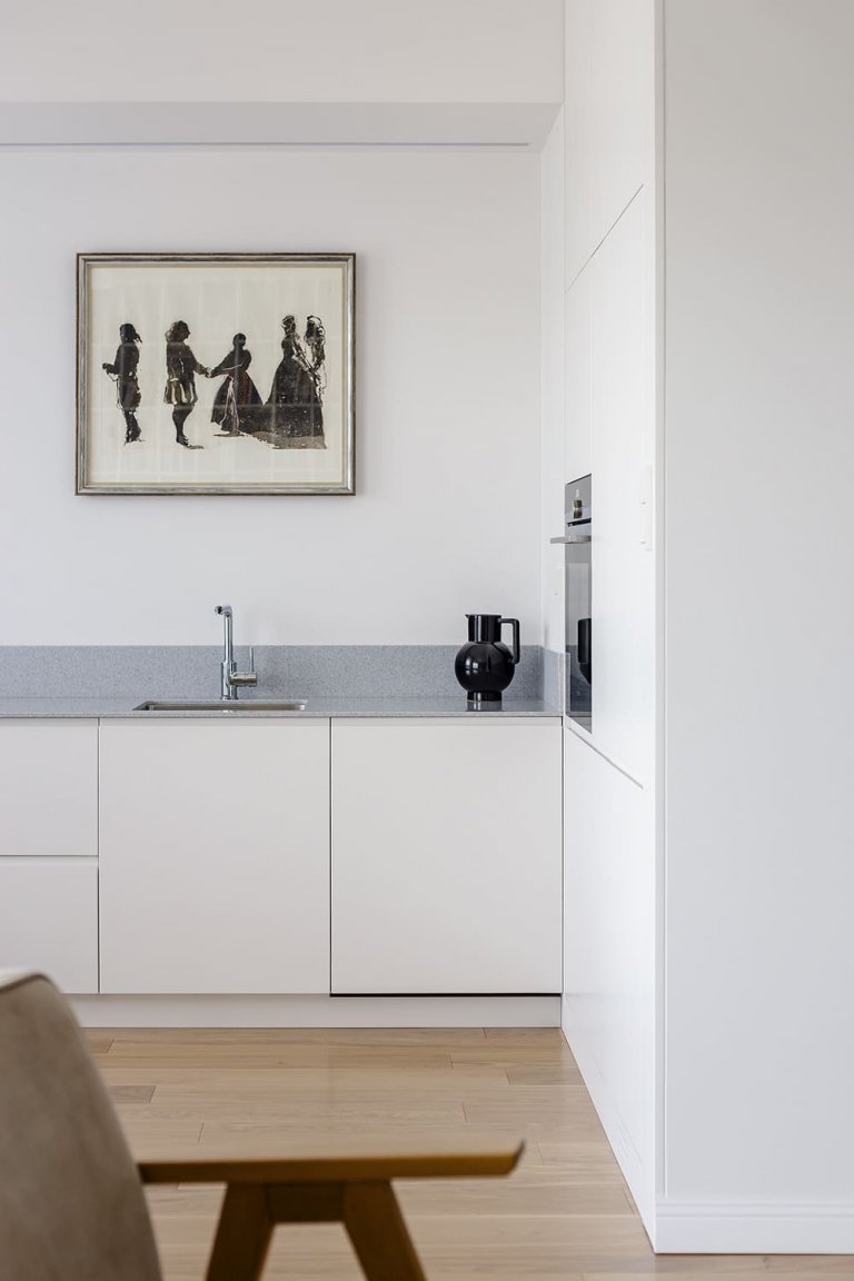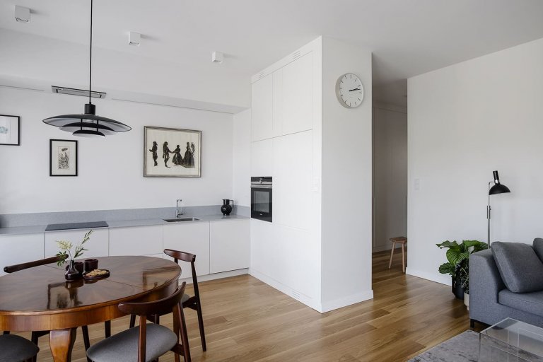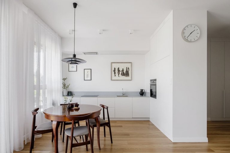 Interiér bytu navrhla Justyna Kolasa ve spolupráci s Patrykem Ławrynowiczem ze studia 3XEL. Vsadili na čistý minimalismus, který však vůbec nepůsobí stroze. Bydlení je naopak velice útulné, hřejivé a svěží.