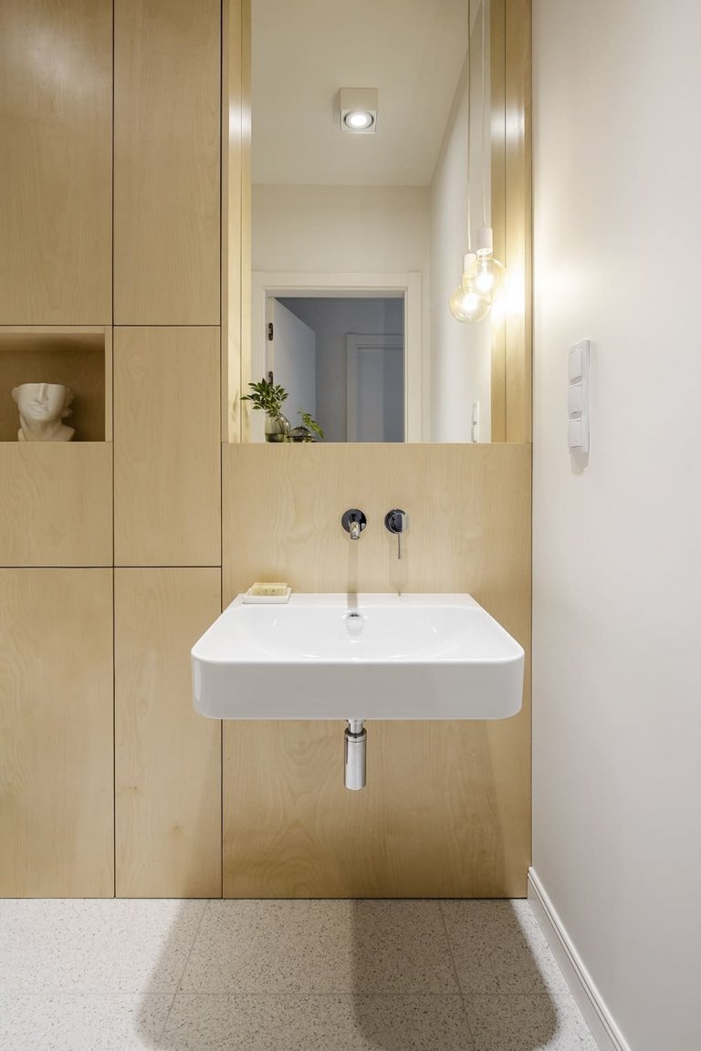 Koupelna je sice malá, ale dokonale designová. Její základ tvoří světlé dřevo a moderní teracové dlaždice. Koupelna působí vizuálně čistým dojmem a nabízí dostatek úložného prostoru. Při jejím návrhu bylo využito zajímavého řešení, kterým je vana se skleněnou zástěnou. Je tedy vhodná jak pro dlouhé domácí lázně, tak pro rychlou osvěžující sprchu, například po cvičení.