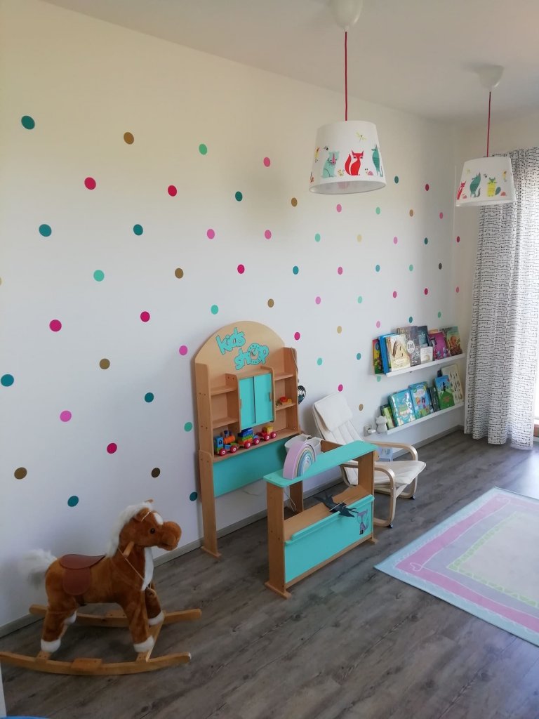 Sedněte si doprostřed místnosti, vyberte, krom bílé, jednu, max dvě základní barvy, které použijete na část stěn. Nemusí to být barevná nutně celá stěna, fantazii se meze nekladou. Barva by samozřejmě měla korespondovat s podlahou a nábytkem. Nyní se zamyslete nad doplňkovými barvami. V těchto barvách nakupte dětské samolepky na zeď a ostatní doplňky.