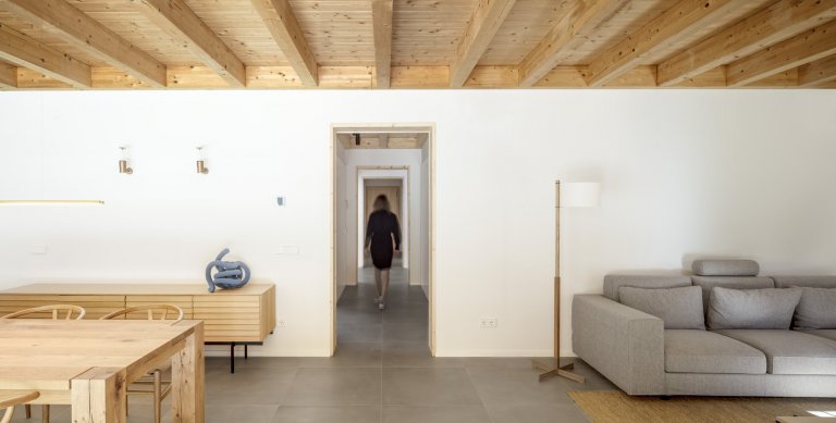 Celý interiér domu je řešen ve třech základních barvách: bílá, šedá a světlé dřevo. Velké otevřené plochy dodávají interiéru vzdušnost a celým domem proudí přirozené světlo. Díky tmavé fasádě z jedné strany domu vynikne hra čtyř objemů, z nichž je dům složený.