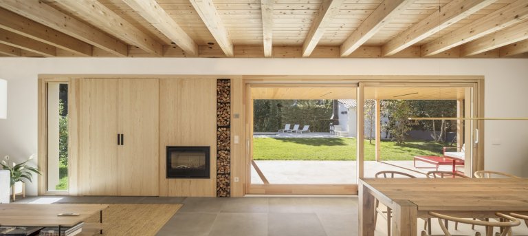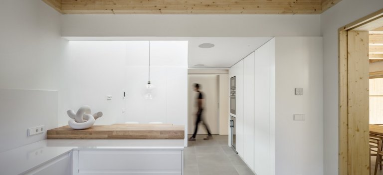 Nový dům nepůsobí masivně i z jiných důvodů - část fasády zjemňuje světlé dřevo a velké prosklení. V části orientované do zahrady je dům bílý, ze strany ulice má tmavou neosobní, ale zato výrazově silnou fasádu s minimem oken. Z jedné strany poskytuje kryté stání na parkování aut.