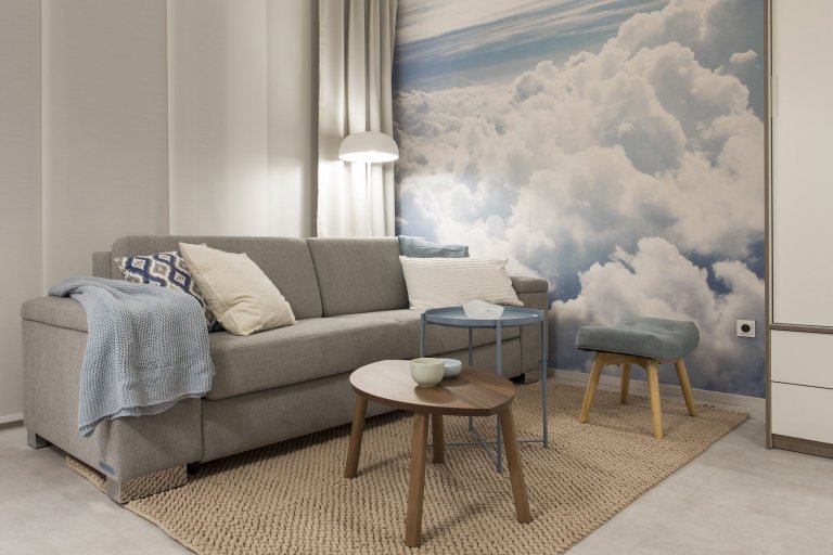 Tahle proměna se povedla na jedničku. Na první pohled zaujme svým něžným půvabem a andělskou nevinností. „Kombinace bílé, bleděmodré a dřeva prochází oběma pokoji, u Aničky byla pak doplněna ještě fialovou. Silueta andělů v obývacím pokoji je u Aničky pojata jako velký nástěnný akvarelový obraz baletky. Koncept nebe prochází z obývacího pokoje, kdy jsme na celou jednu stěnu použili fototapetu s motivem mraků. V pokojíčku bylo nebe připomenuté v podobě látkových nebes kolem postele. Byt je zrekonstruovaný, není třeba dalších větších úprav, do budoucna snad jen zútulnit malý pokoj pro syna,“ uzavírají celou proměnu designéři.