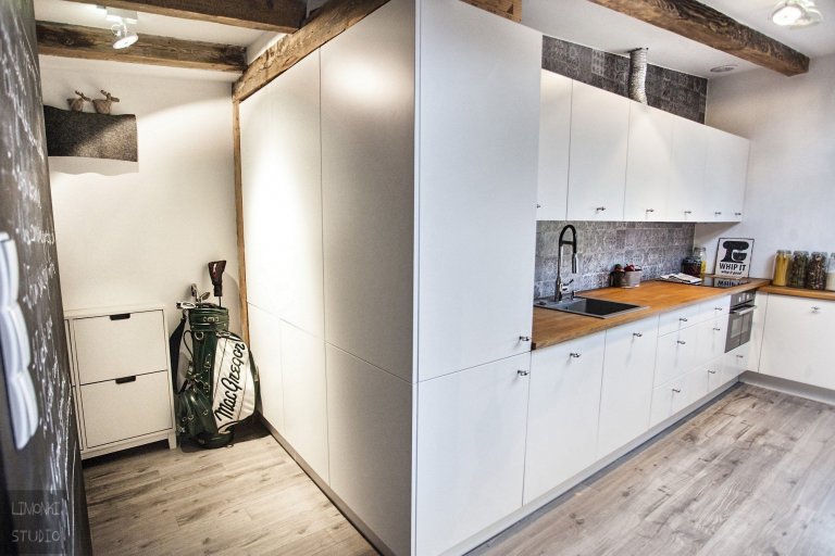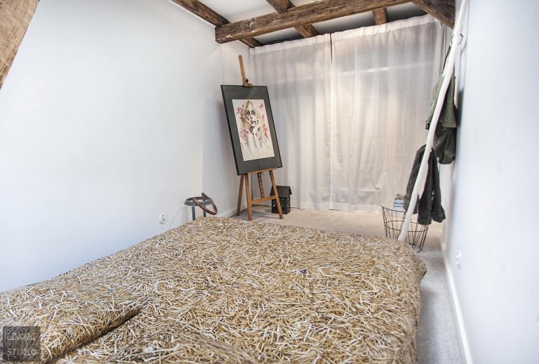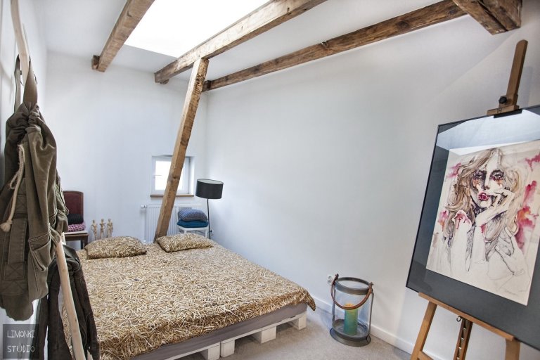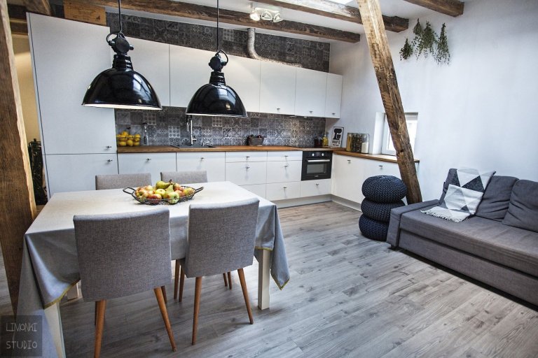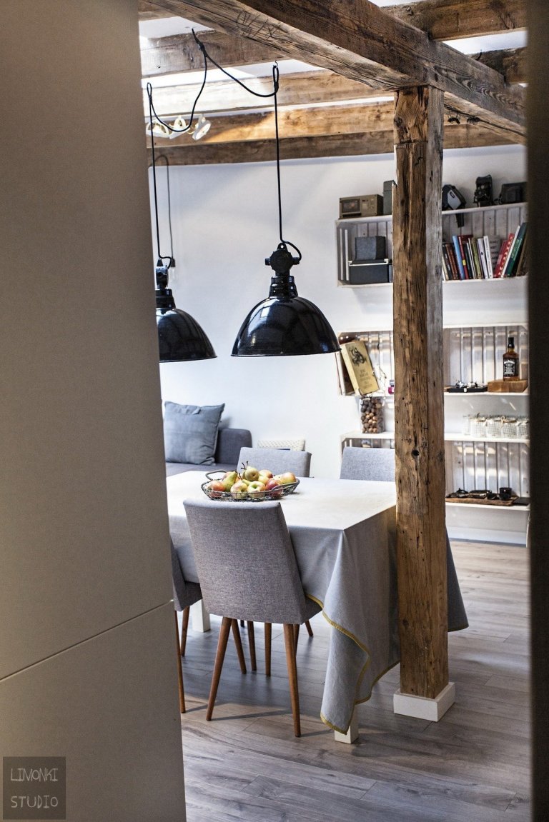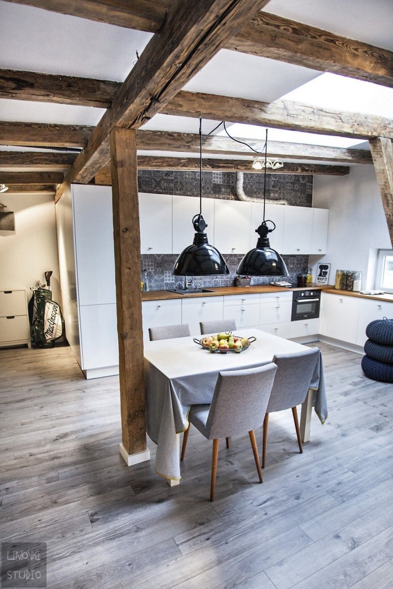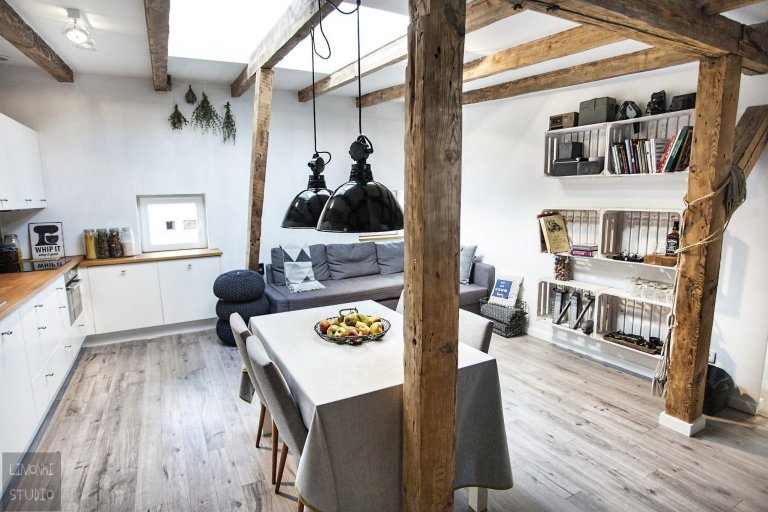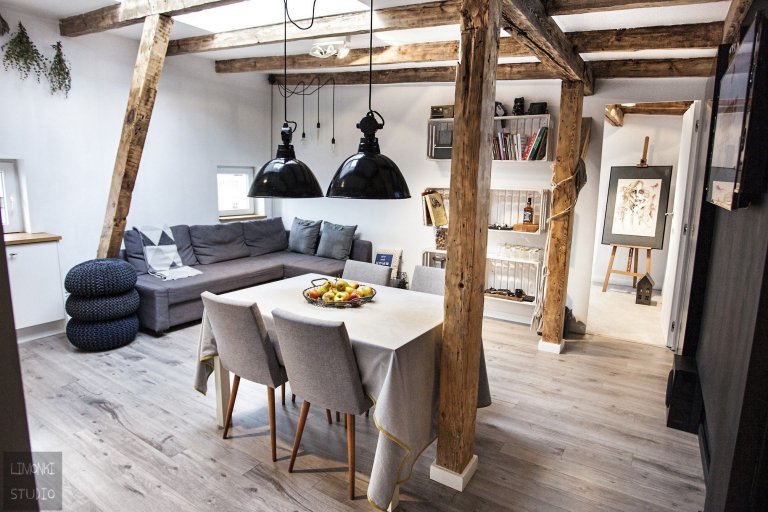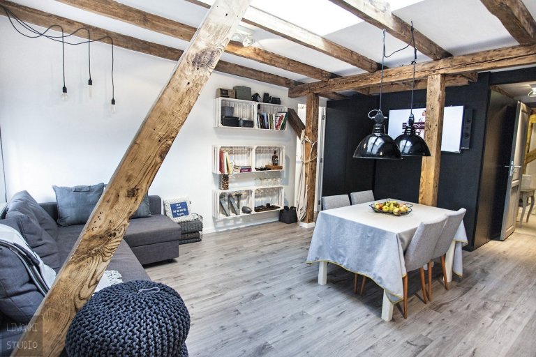 První dojem je důležitý. Své o tom ví majitel tohoto podkrovního bytu. Prostor jej natolik okouzlil, že měl o koupi okamžitě jasno. Trámy udaly jasný směr při realizaci rekonstrukce a díky přání majitele se je podařilo zachovat. Naopak je architekti nechali vyniknout. Majitel měl svou představu o tom, jak by jeho bydlení mělo vypadat. Návrhu se ujalo polské architektonické studio ,,Lmonka“ a dbalo na všechna přání zákazníka.