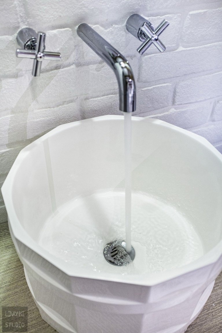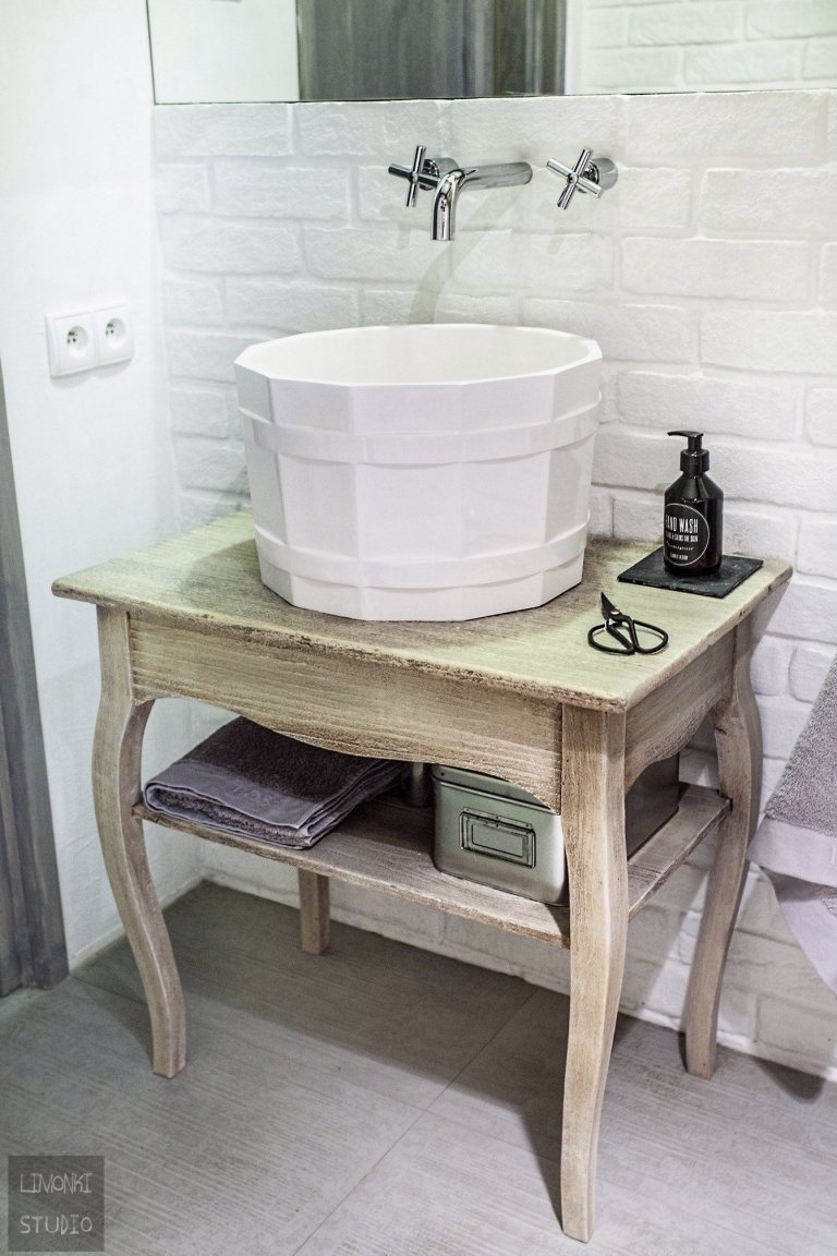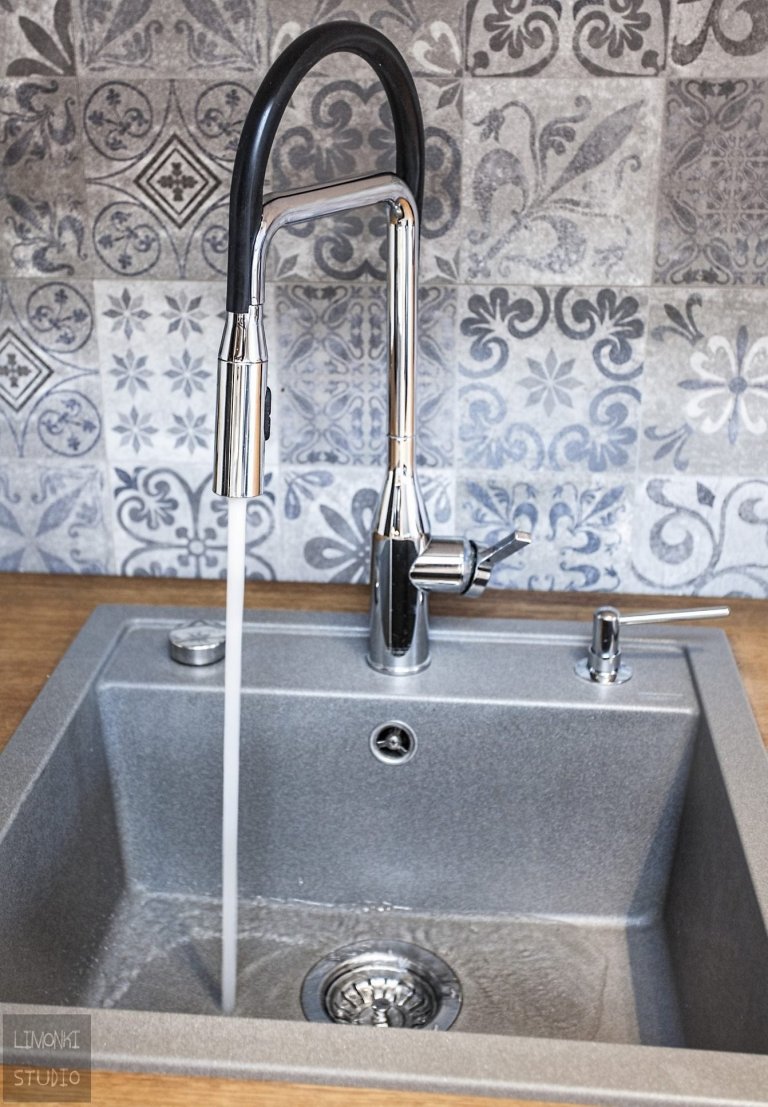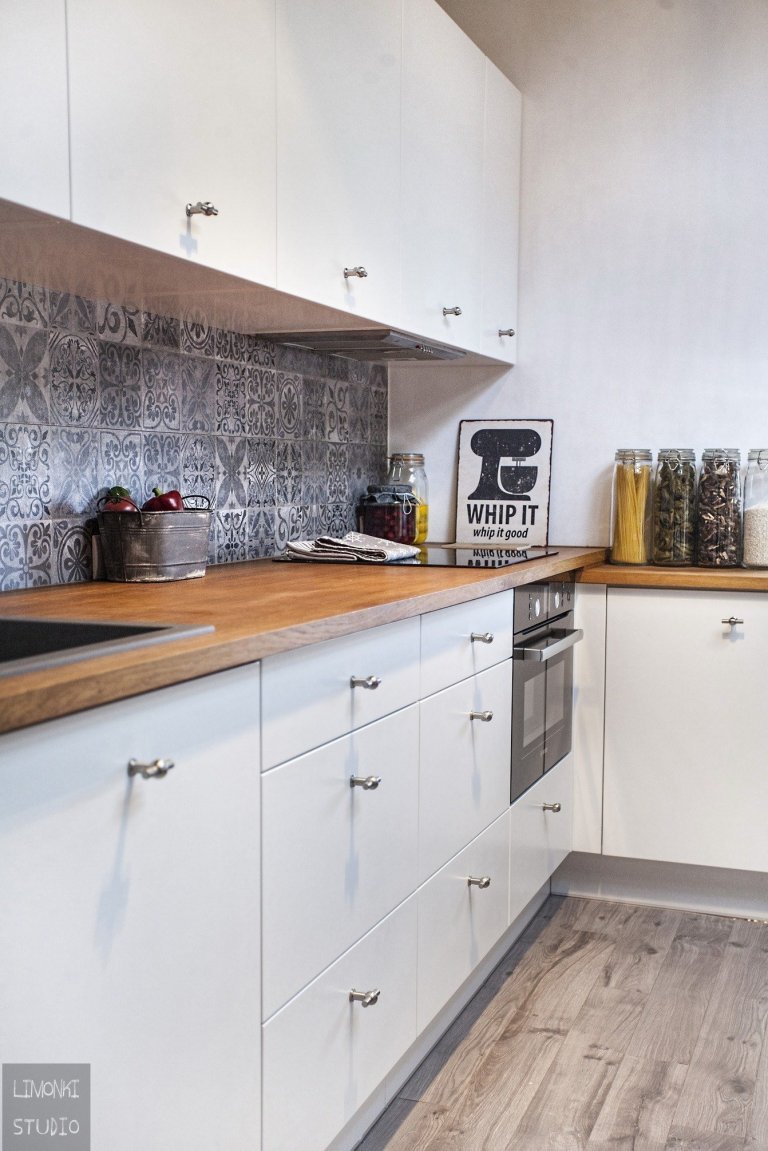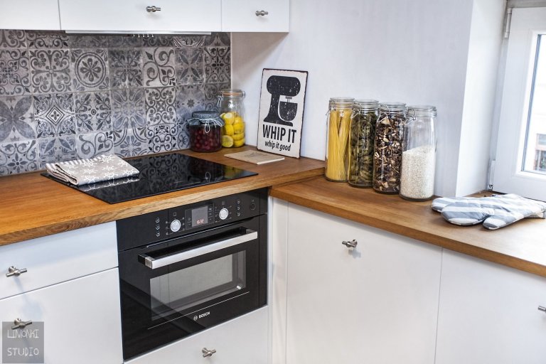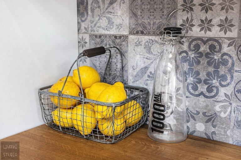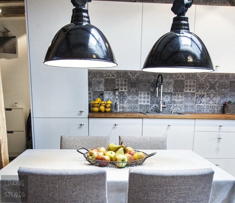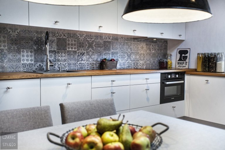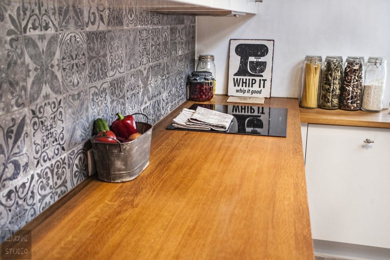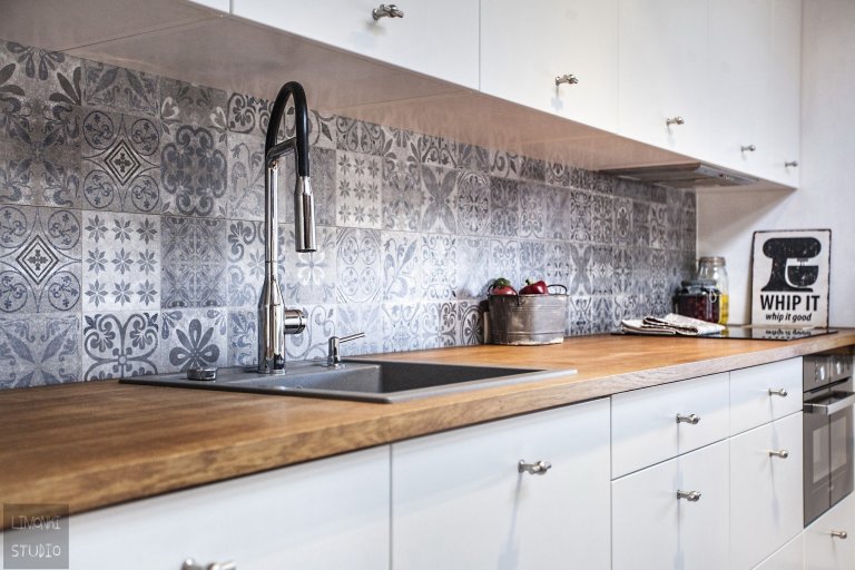 Bydlení se rozprostírá na pouhých 48 m2 s výškou stropu 2,7 m. Uprostřed bytu najdeme bílou kuchyňskou linku s masivní pracovní deskou a krásnými kachličkami s geometrickým vzorem. Pozornost si zaslouží koupelna se solitérní vanou a neobvyklým umyvadlem.