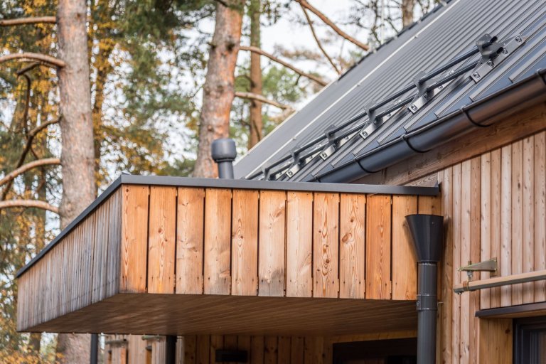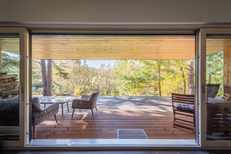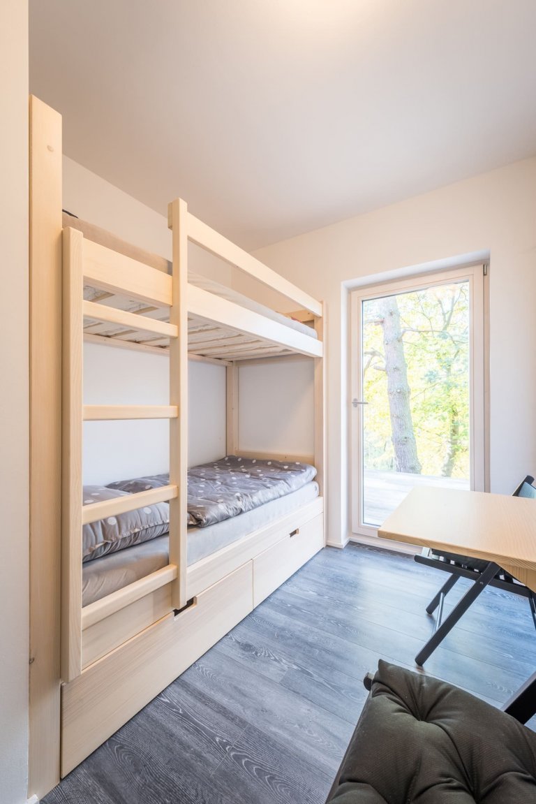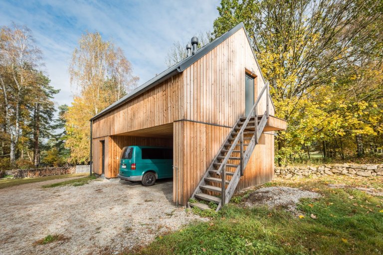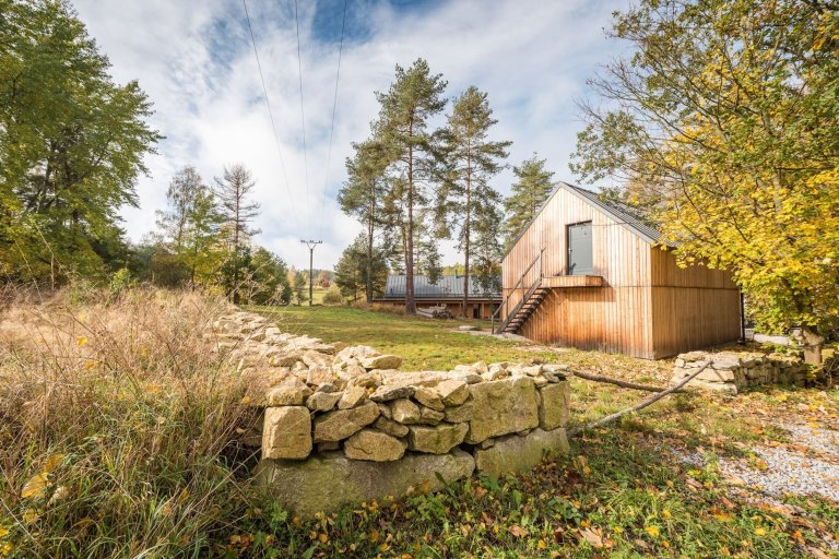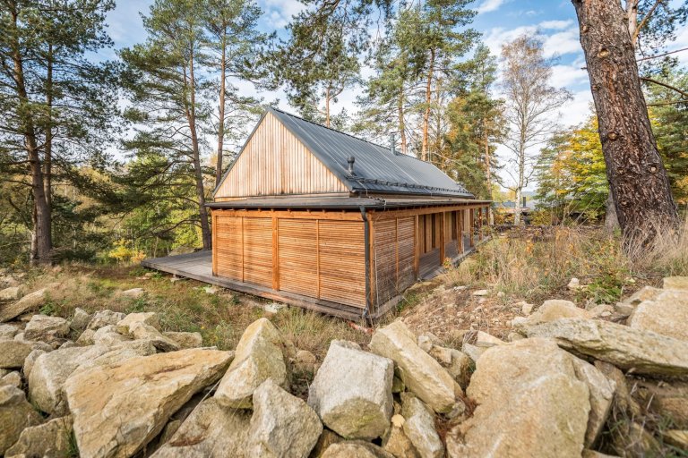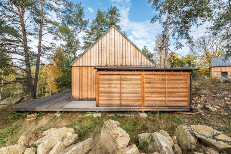 Pod taktovkou profesionálů ze studia Labor13 vyrostl v náruči lesa České Kanady víkendový dům, který sestává ze dvou oddělených dřevostaveb. Jedna z nich slouží jako hlavní obytná zóna, druhá skrývá saunu a garáž. Nárazový domov dvou tváří je nejen krásný, ale také bezpečný. Disponuje totiž posuvnými dřevěnými panely, které uzavřou velká okna, jakmile nastane čas odjezdu do ruchu všedních dnů.