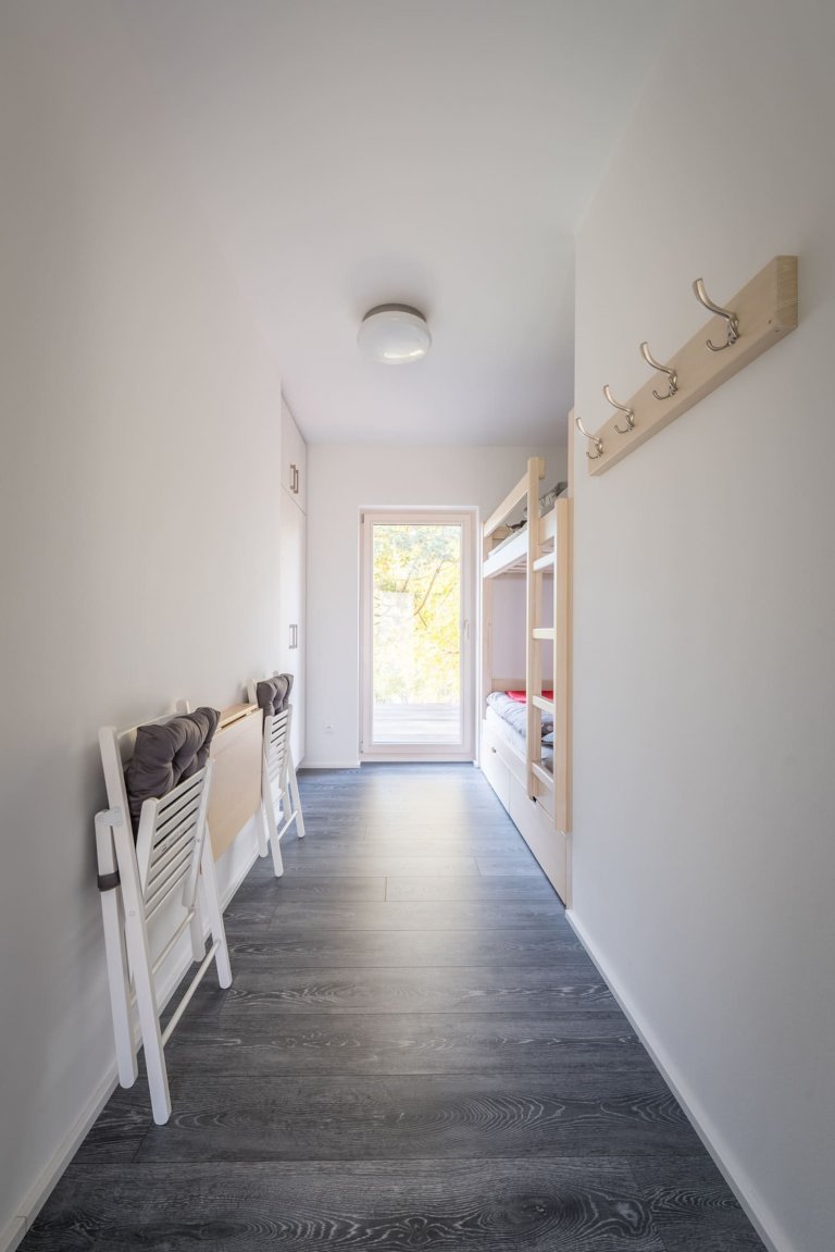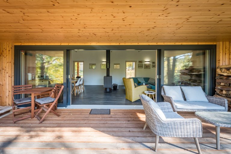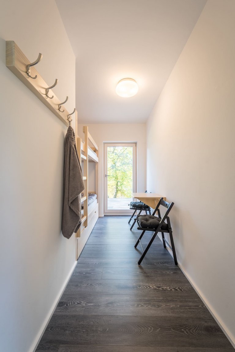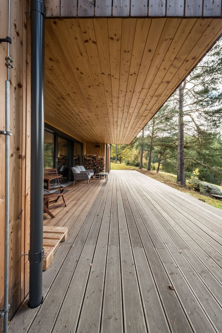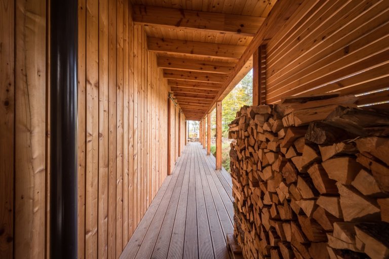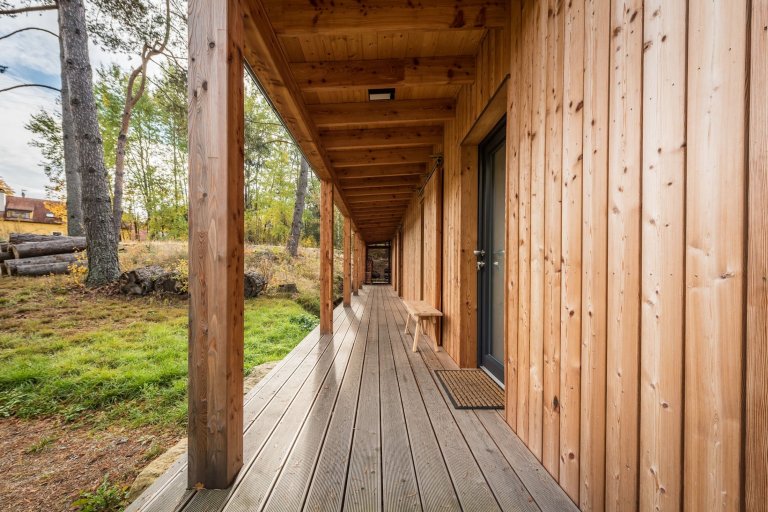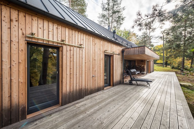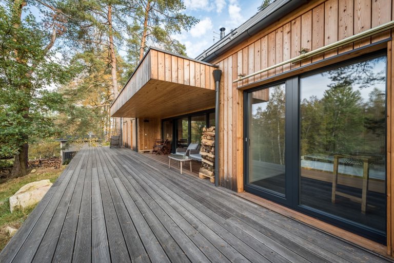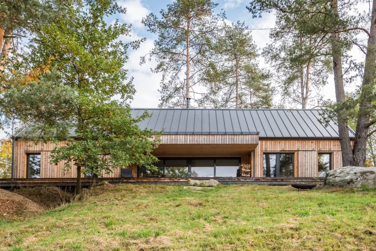 Víkendový dům usazený v jižních Čechách nedaleko Nové Bystřice v oblasti České Kanady je ideálním místem pro doplnění energie po náročném pracovním týdnu. Obklopený borovicovým lesem a zvuky zdejší fauny poskytuje to pravé útočiště pro dokonalý odpočinek. Velkorysá odpočinková zóna vzniká především v teplých měsících, kdy lze otevřít velkou prosklenou stěnu srdce domu a smazat tak hranici mezi interiérem a přírodou. Centrální prostor dřevostavby je přitom otevřený do krovu. Vzniklá hlavní obytná místnost plná světla zahrnuje kuchyni, jídelnu a obývací pokoj. Ostatní pokoje ustoupily prostoru centrální zóny, jsou menší a určené převážně k přenocování. Vzhledem k tomu, že okolí hlavní dřevostavby střeží vzrostlý les, nebylo třeba obávat se zakomponování velkých prosklených ploch. Ty lze navíc zakrýt dřevěnými posuvnými panely, a tak se postarat o bezpečnost i soukromí.