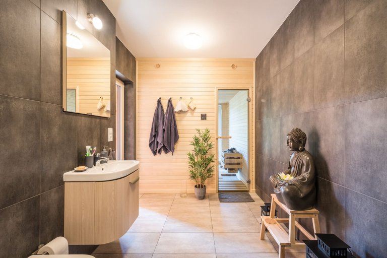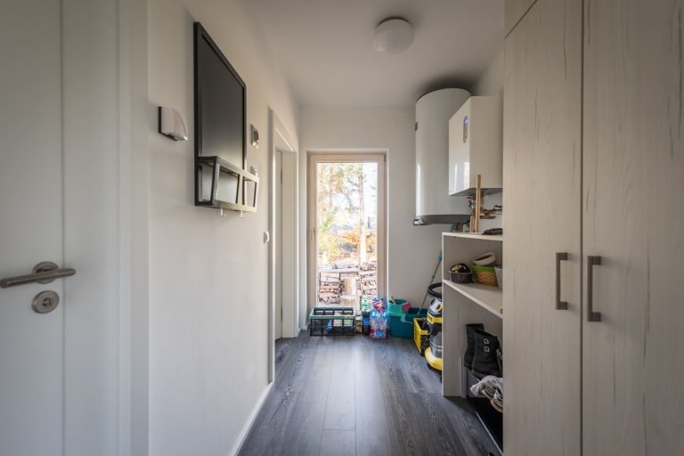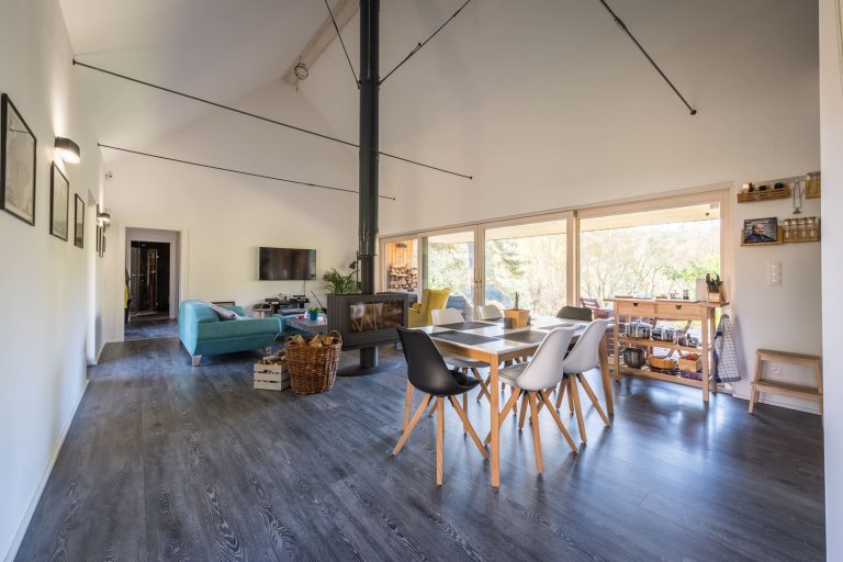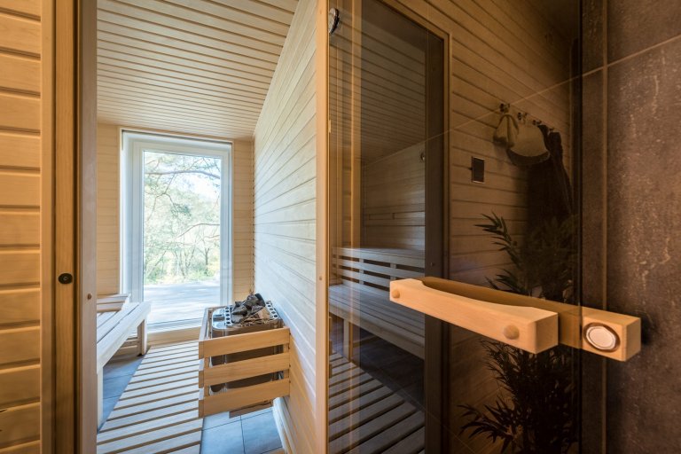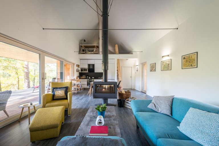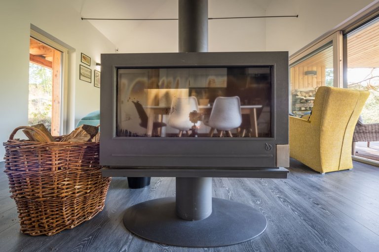 Víkendový dům postavený z dřevěných panelů není díky kvalitnímu zateplení energeticky náročný. V zimních měsících se dům vytápí velmi rychle, a to díky jednoprostorové dispozici a vysoké výhřevnosti krbových kamen. Existuje tu však i možnost doplnit tento způsob vytápění praktickým a na dálku ovládaným elektrickým topením. K tepelnému komfortu napomáhá také sauna umístěná v druhé dřevostavbě. Zdá se tedy, že tomuto místu k hřejivému odpočinku a schopnosti odplavení všech starostí nechybí už vůbec nic