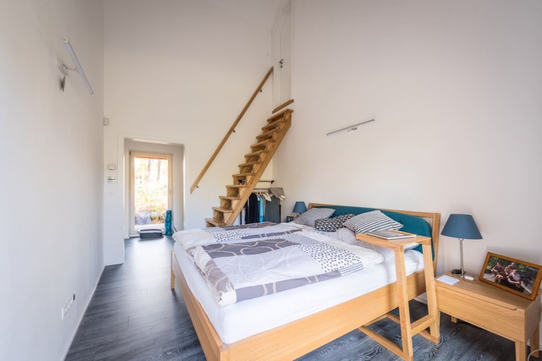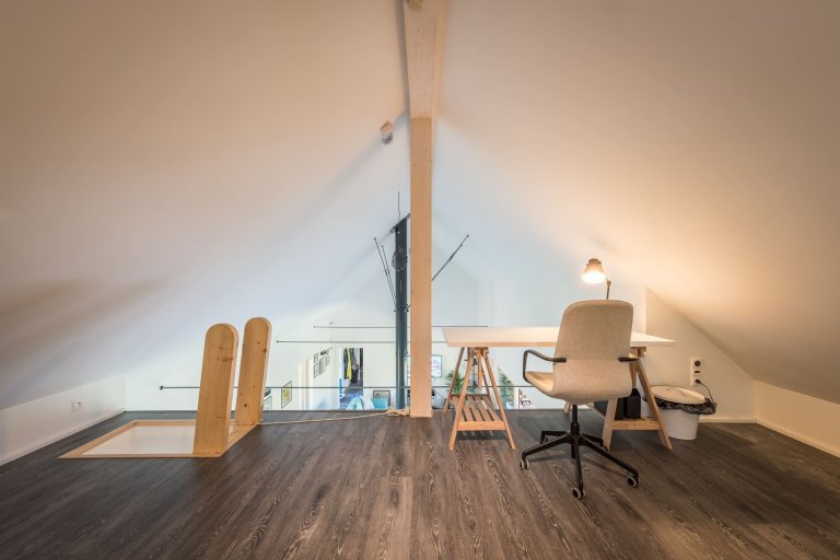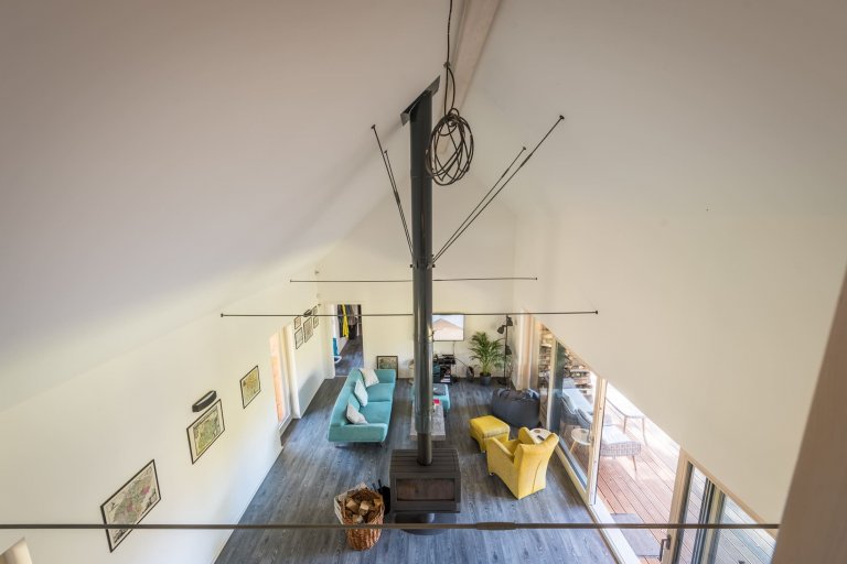Centrální prostor dřevostavby je otevřený až po střechu, přičemž viditelný krov značně umocňuje atmosféru domu. Ta je prohřátá světlými tóny dřeva, které zjemňuje bílou výmalbu jednotlivých místností. Najdeme zde však i odstíny tyrkysové a žluté barvy. jež interiér rozjasňují a dodávají mu okouzlující charisma. Vnitřku domu vládne minimalismus a praktičnost. Je možné zde najít prvky industriálního i etno stylu. Výsledkem je nápadité a velmi osobité bydlení, ve kterém jde praktická stránka ruku v ruce s tou estetickou.