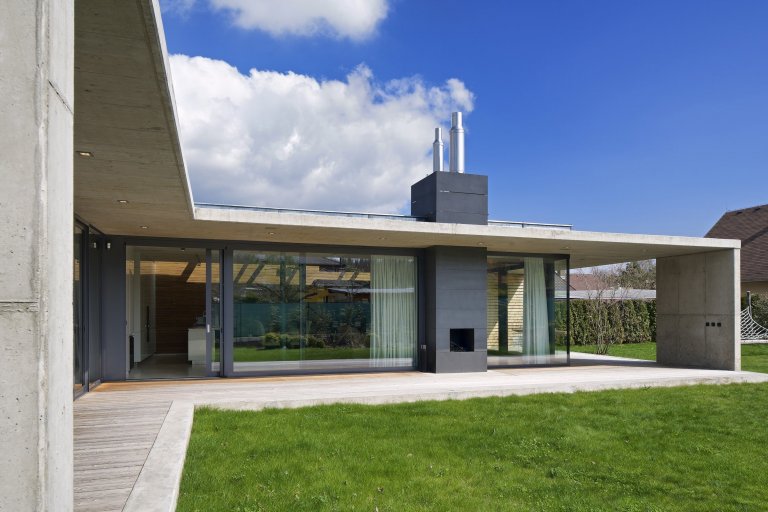Celý dům vyniká i díky své hře s kontrastními materiály. Část domu je obložena modřínovým dřevem, další pohledovým betonem s šedou omítkou. Nechybí ani tmavé grafitové prvky z oceli. Jinak dokonale horizontální charakter domu rozbíjí vertikální prvek v podobě dvou komínů.