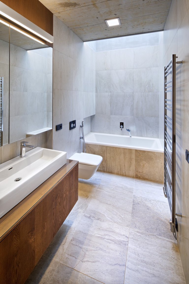 I když se může dům zdát při pohledu od ulice poměrně uzavřený, není to vůbec pravda. Do domu se dostává opravdu velké množství přirozeného denního světla skrze prosklené stěny v části domu směřující do zahrady, ale i skrze pásové střešní světlíky, které jsou v koupelnách, ale i v obytné části domu.