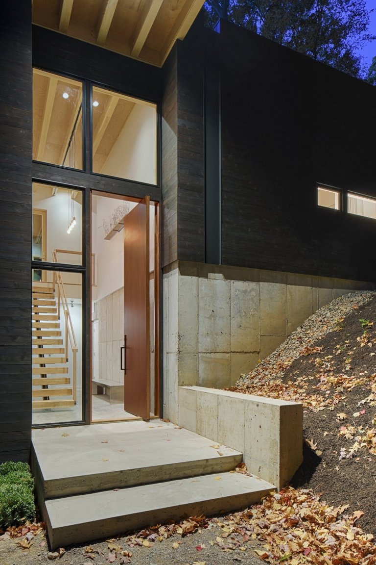 Dům je zasazen do údolí, přesněji řečeno přímo do svahu, a tak jeho vzhled tolik nenarušuje tón krajiny. A to nejen díky umístěni, ale také díky vnějšímu vzhledu, ve kterém architekti uplatnili své znalosti z japonské techniky úpravy dřeva sugi ban = zuhelnatění dřeva. Díky této technice působí cedrové dřevo originálně a luxusně. Na kráse domu neubírají ani žlaby, které jsou v tomto případě vložené a neruší tak velmi elegantní vzhled. Obdélníkový tvar domu, který je částečně zakomponován do kopcovité krajiny, vystupuje z nižší, ale velkoryse řešené garáže, a vytváří tak otevřený prostor ideální pro zábavu, relaxaci u ohně nebo přípravu domácího jídla.