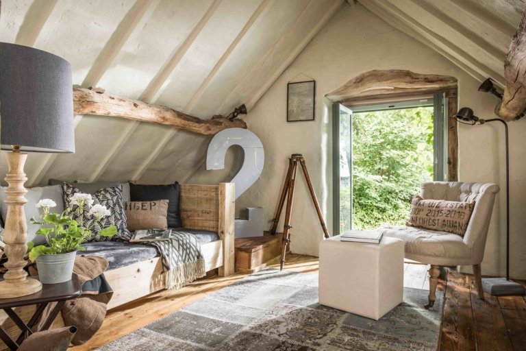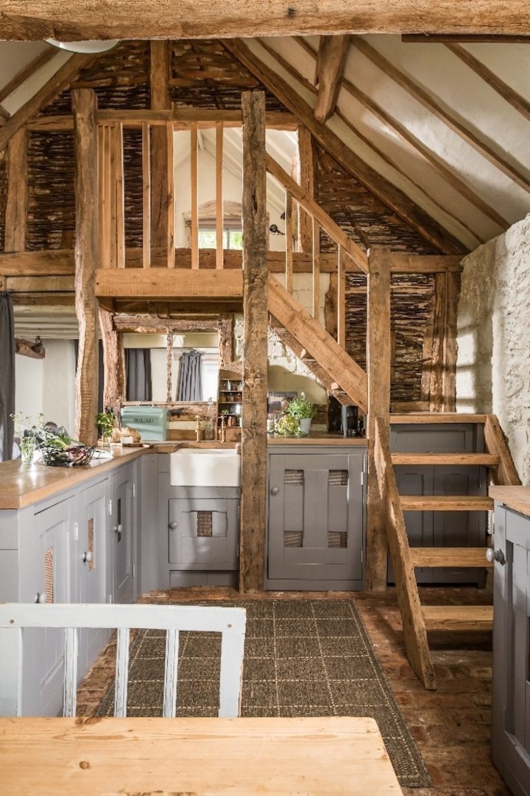 Nejvýraznější je ložnice, která se nachází hned u obytném prostoru: do bílého oděná královská postel, těžké šedé závěsy, sprcha hned po ruce. Navzdory svému stylu, který ne vždy vidíme vhodným iz praktického hlediska, je tato stará usedlost řešena plně funkčně. Ve vnitřní eklektické otevřené kuchyni najdete kvalitní sporák a veškeré potřebné vybavení, včetně myčky nádobí a pračky. Navzdory moderním spotřebičů však interiér nepřišel o nic ze své stylovosti. Nad kuchyní se nachází malá relaxační místnost, do které se dostanete po dřevěném schodišti.