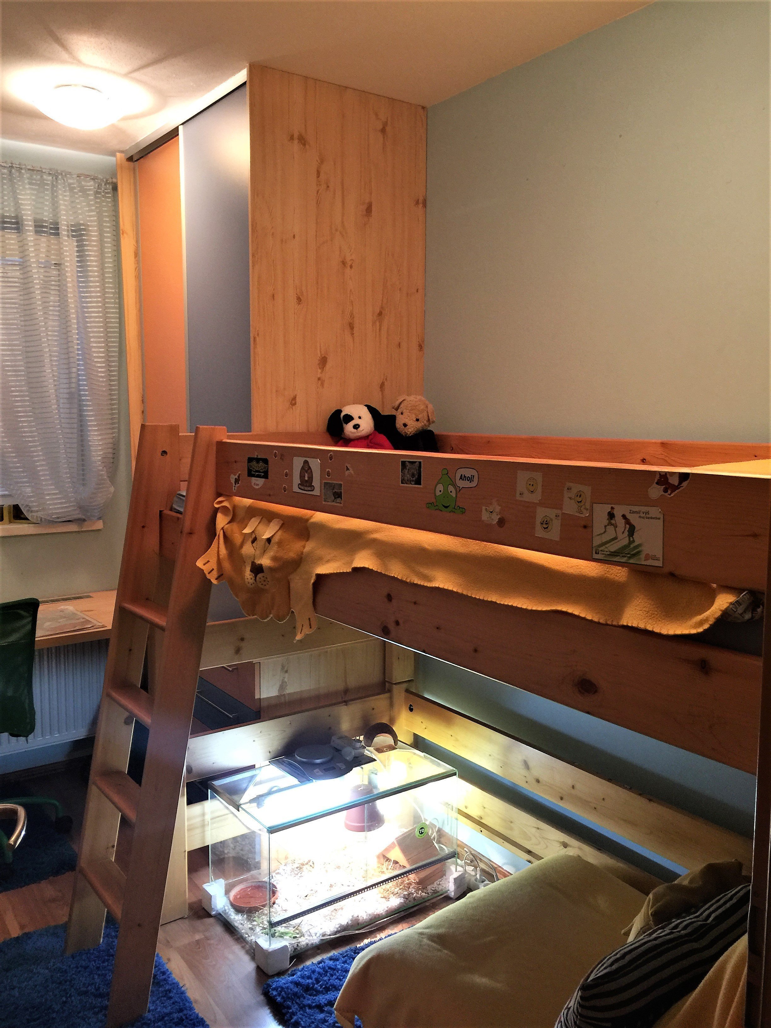 Většina z nás po stěhování nějakou dobu bydlí v provizorních podmínkách. Se slibem, že brzy vše vymění, marně ladí původní nábytek s novými kousky. Nebyli jsme výjimkou. Tenkrát pětiletému synovi naprosto stačila původní zvýšená postel, ke které jsme pouze přidali stůl a skříň, vyrobené na míru. Nenapadlo nás, že nám hošík vyroste do takové krásy. Původní sušárna, předělaná na dětský pokoj o velikosti necelých osm metru čtverečních, sloužila dobře do doby, kdy výška majitele překročila hranici 190 cm.