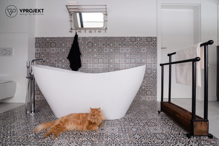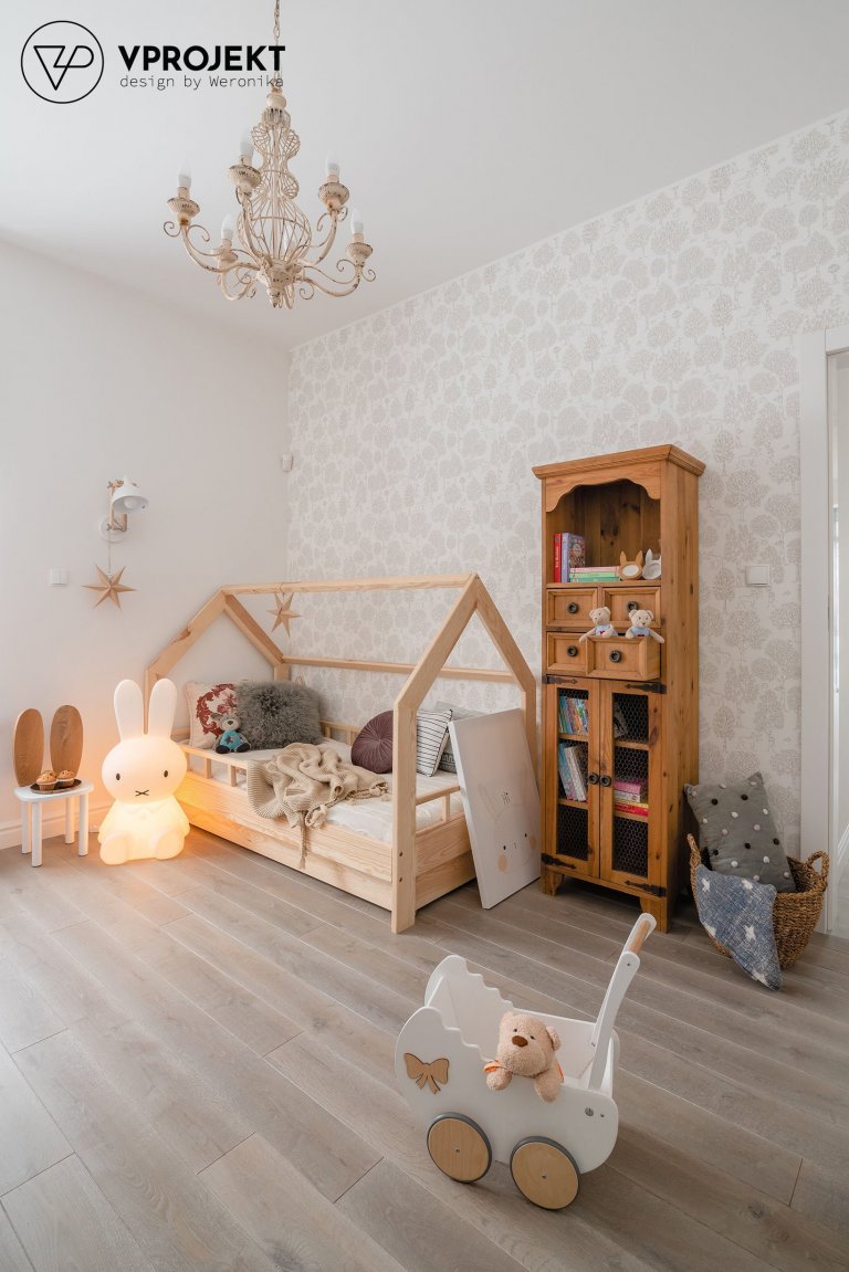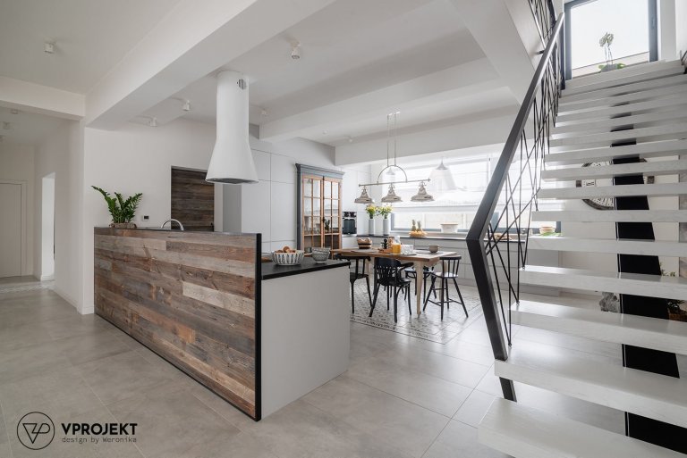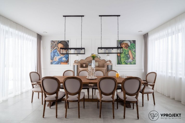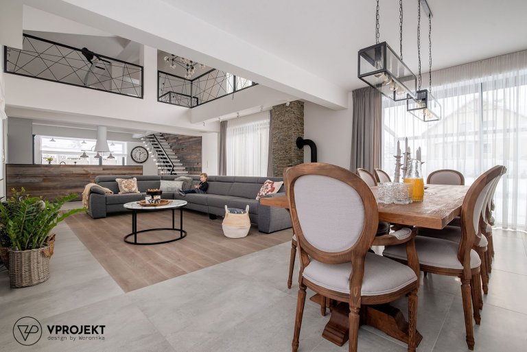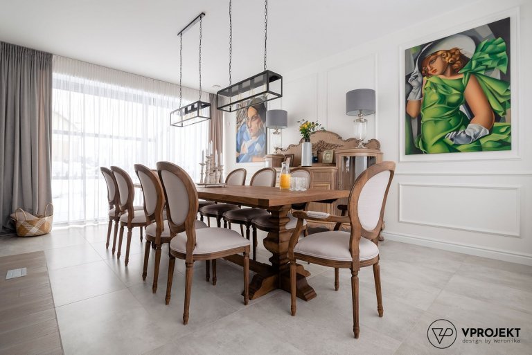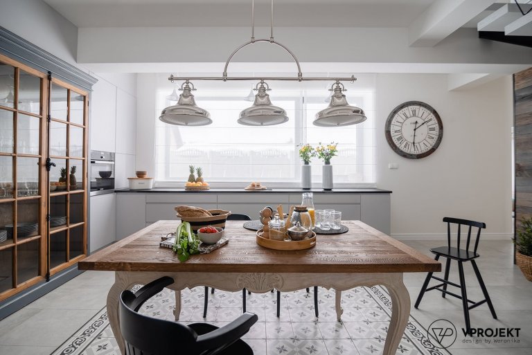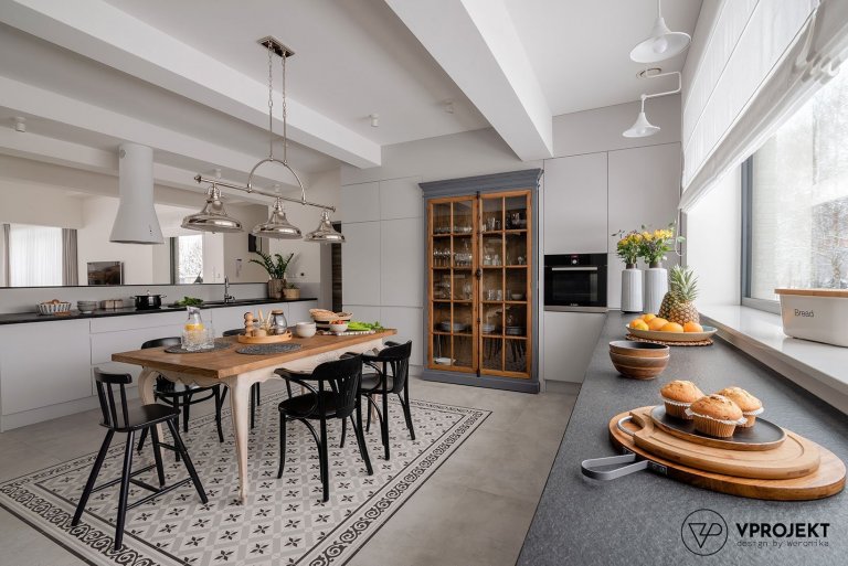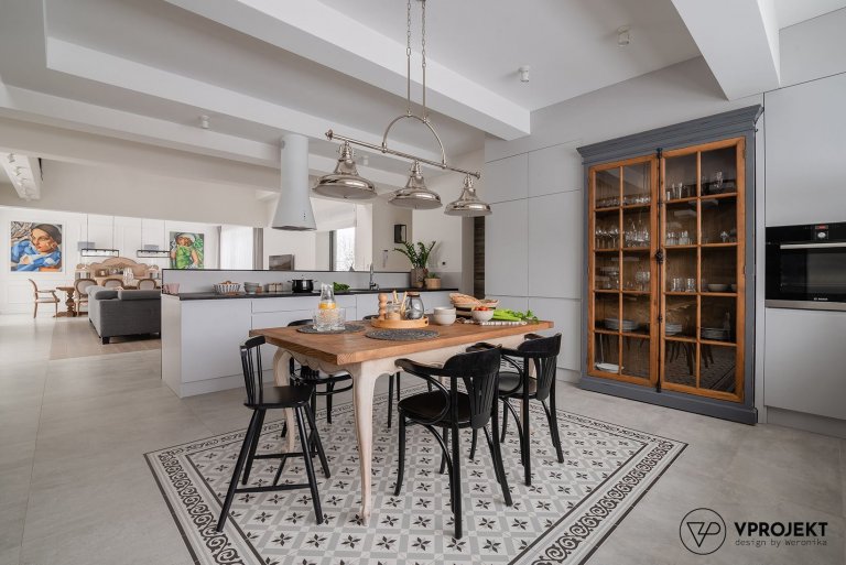 Na pozadí bílé barvy ozvláštněné jemně šedou vystupuje přirozená krása dřeva, ze kterého je vyroben například elegantní jídelní stůl či vestavěný kredenc. Právě historizující nábytek se v interiéru stará o jistou majestátnost. Stačí se podívat na překrásné židle jakoby ze zámku. O dotek starých časů se starají také až na zem splývající závěsy a záclony, vznešené svícny, nádobí, lustry, skříňky, komody, stolky, poličky či romantické vzory na podlaze v kuchyni či na dlažbě v koupelně. Zajímavý předěl pak představuje řešení mezi chodbou a kuchyňskou linkou, které opět odkazuje na přirozený půvab dřeva.