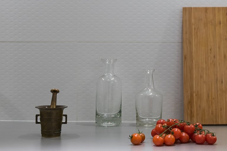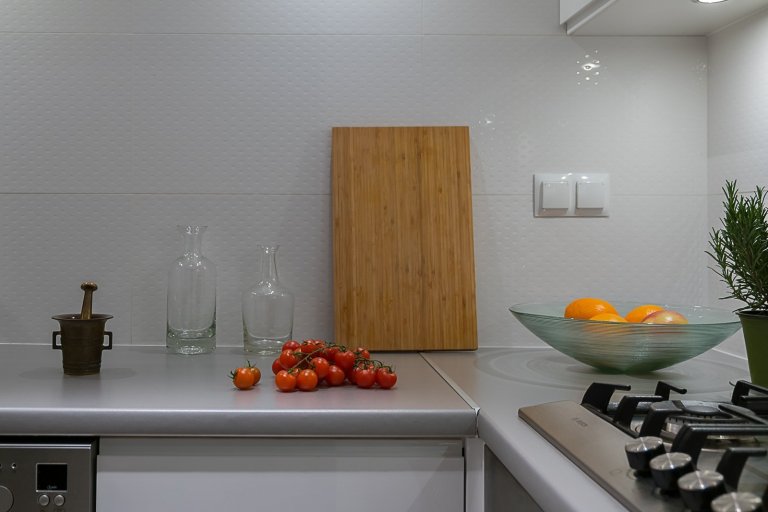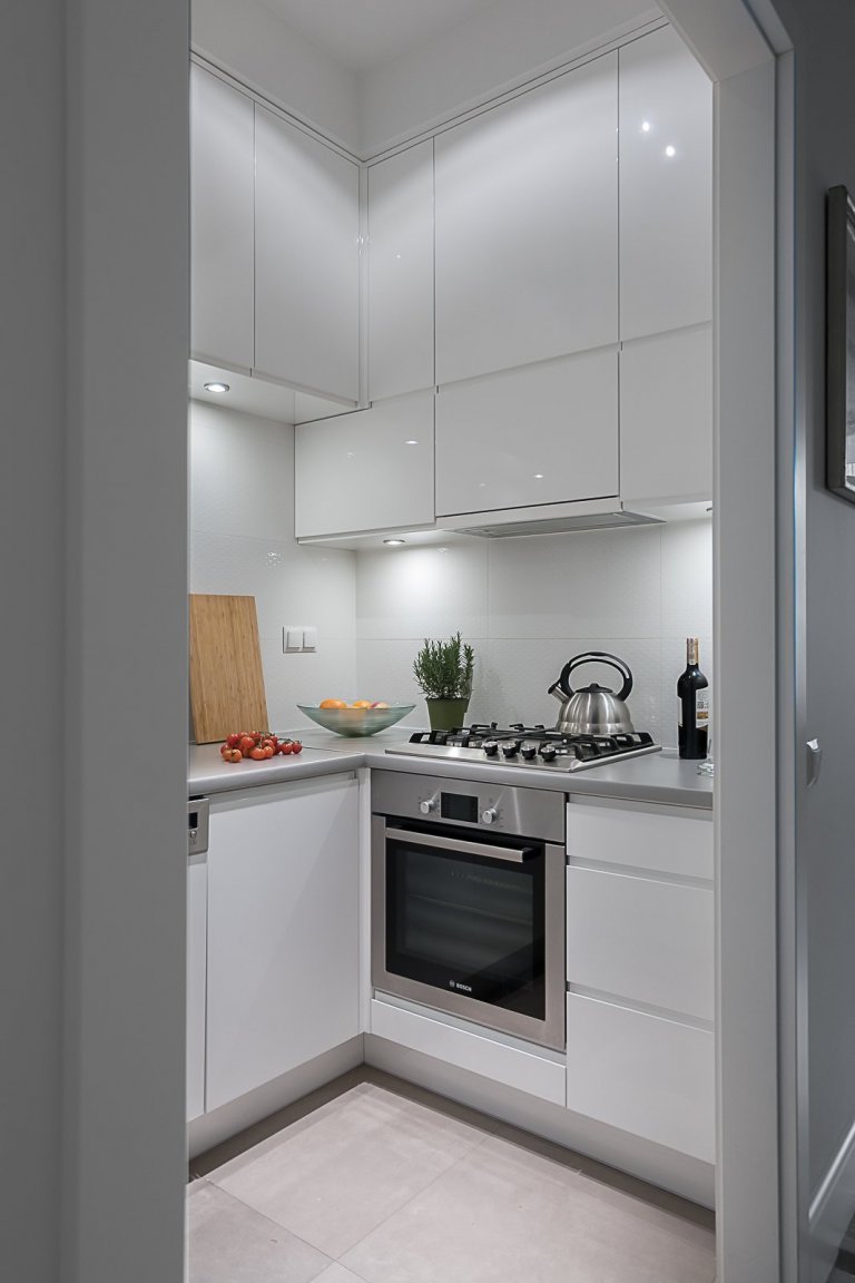 Důležitým rysem tohoto projektu je kuchyň a koupelna, které jsou navzdory jejich malým rozměrům plně funkční a esteticky vzhledné. Ovládají je jasné barvy, které celý prostor opticky zvětšují. Teplou a domáckou atmosféru zajišťují dřevěné prvky a starší doplňky. Díky pozoruhodným obkladům stěn je prostor tohoto bytu jasně rozdělen. Tapeta, která se nachází na dvou místech - v ložnici a za pohovkou - činí tato místa velmi útulnými. Vkusně vypadají i modré závěsy, které celému bytu dodávají více hravosti.