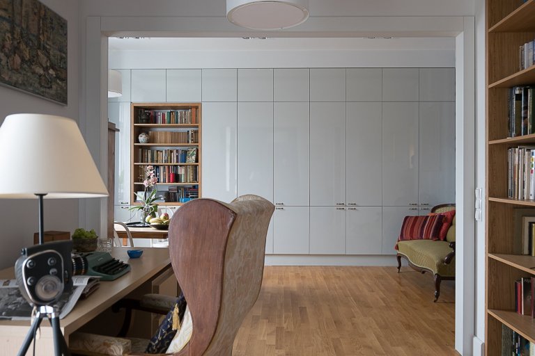 V nájemním domě je původní, nově obnovený výtah, což ´velmi usnadní přístup k bytu lidem s omezenou pohyblivostí. Majitel tohoto bytu chtěl, aby byl moderní a obsahoval vše potřebné, ale zároveň vyslovil své přání zachovat přirozený odkaz místa a jeho historickou hodnotu. Kombinace jednoduchého moderního designu s historickým nábytkem a příslušenstvím vytvořila přátelskou atmosféru. Lakovaná podlaha je perfektním zázemím pro starožitnou pohovku či stůl, vše je doplněno všudypřítomnými knihami a malbami.