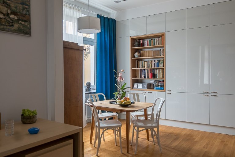 Nepochybnou výhodou tohoto bytu jsou velká okna, která do prostoru nesou jasné světlo. V kombinaci s modrými akcenty vytvářejí idylickou atmosféru. Moderní interiérové prvky jsou začleněny do prostoru tak, aby nebyly vidět, nebo aby dokonale ladily k historickým a přirozeným prvkům bytu.