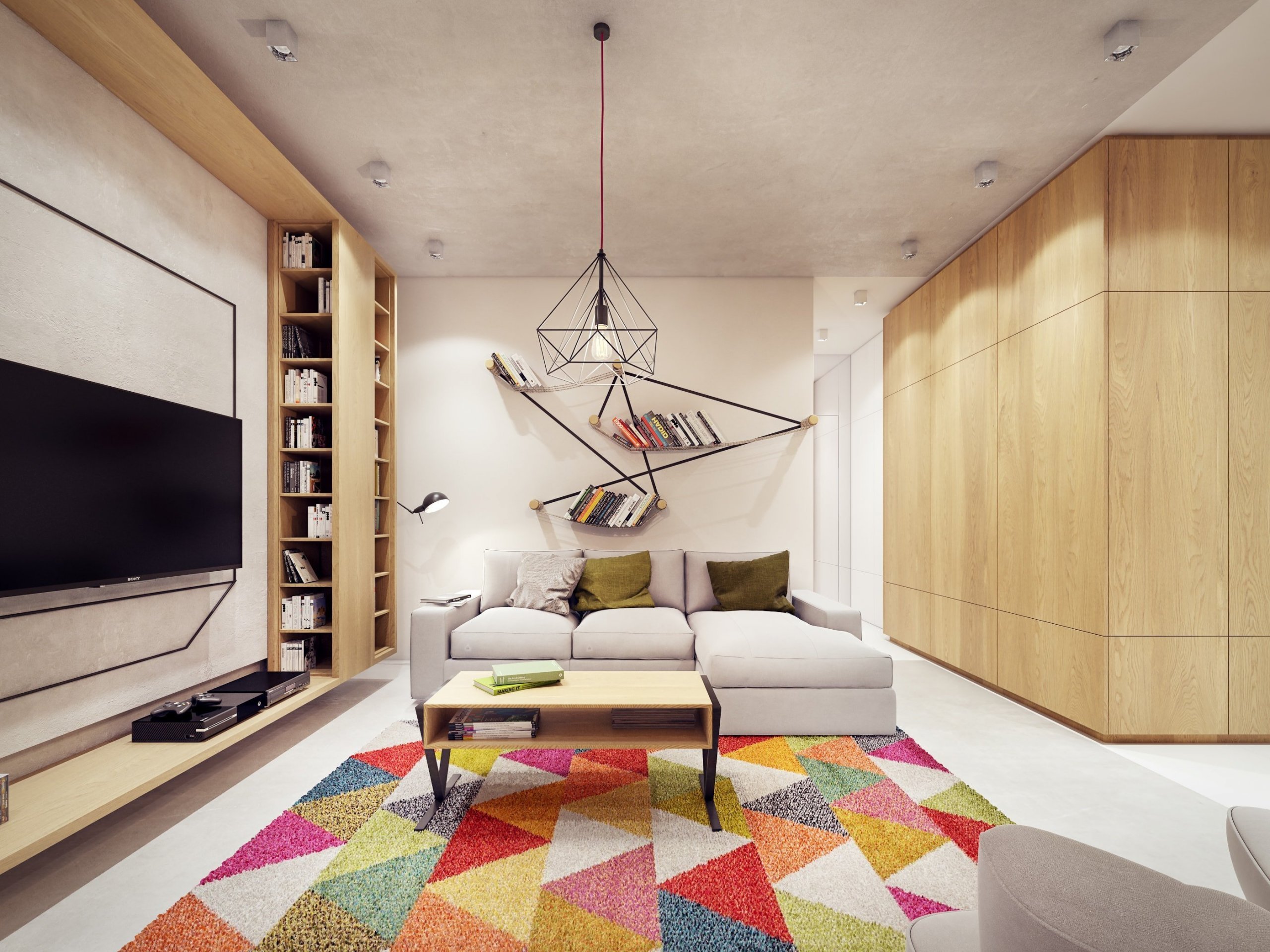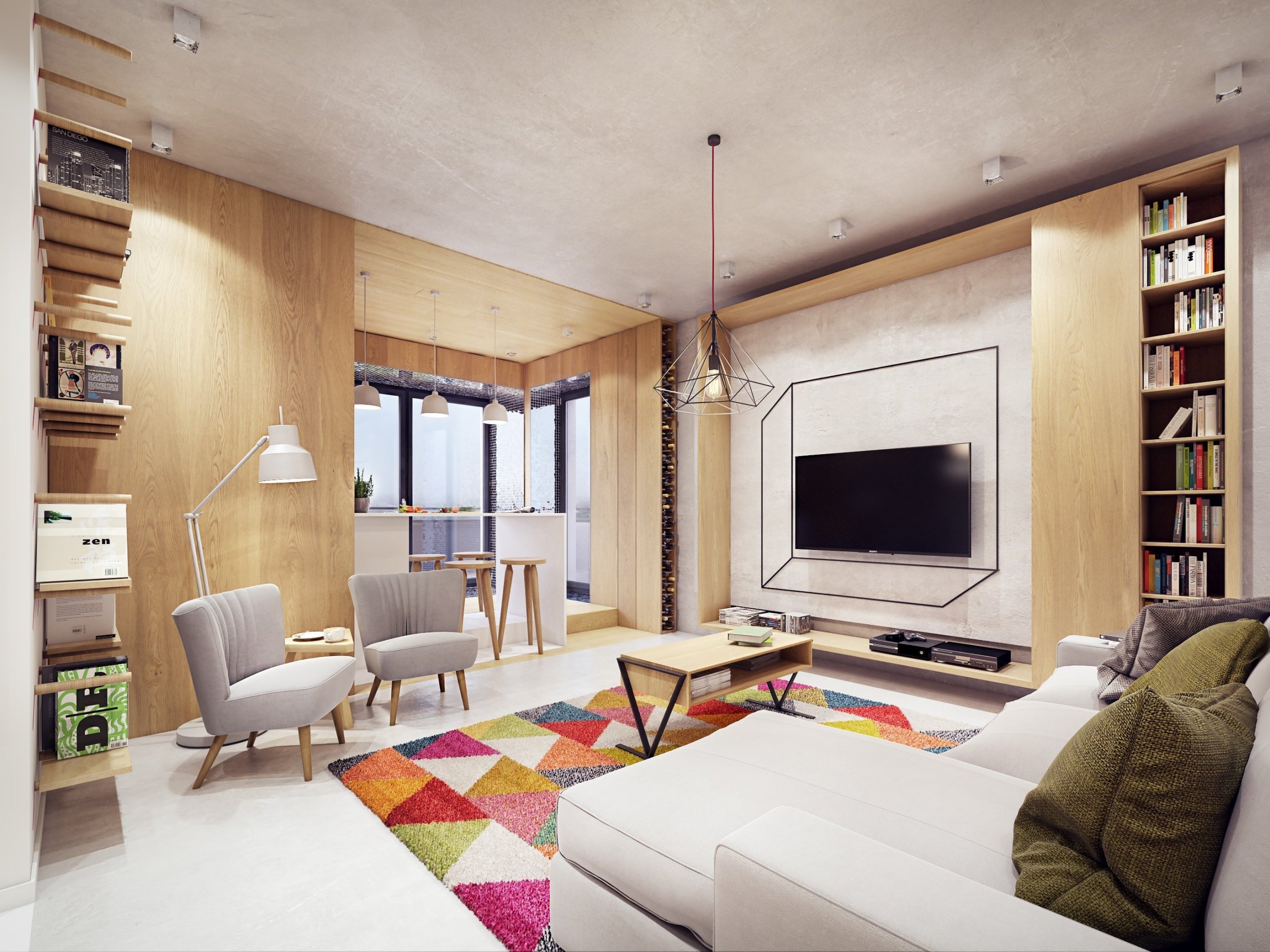 Celý byt, s výjimkou ložnic a koupelen, je zařízen v jasných barvách. Obývací pokoj a pokoj pro děti trpí nedostatkem oken, na což museli architekti při své práci brát ohledy. Obývacímu pokoji dominují tlumené, ale i jasné barvy. Energickým prvkem je zde koberec, který na nás může působit minimalisticky, tak velmi jednoduchá knihovna. Geometrické vzory najdeme kromě koberce a knihovny na více místech. Například jako grafiku na stěně, na lampě a jako základnu konferenčního stolu.