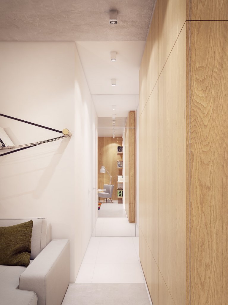 Dalším způsobem, jak opticky zvětšit prostor, je použití zrcadel. Tato myšlenka byla použita na obou koncích chodby. Zrcadla jsou namontována jak na stěnách, tak na dveřích. Ve vstupní chodbě se nachází velká skříň se zavřenou a otevřenou částí, kousek naproti je portrét, jenž převzal Franciszek Ammer ze série Exclusion II. Portrét skvěle zapadá do minimalistického zařízení bytu.