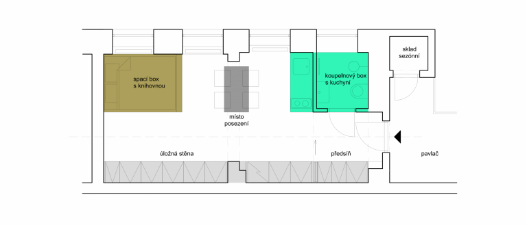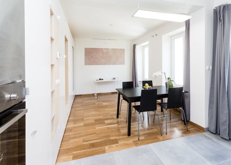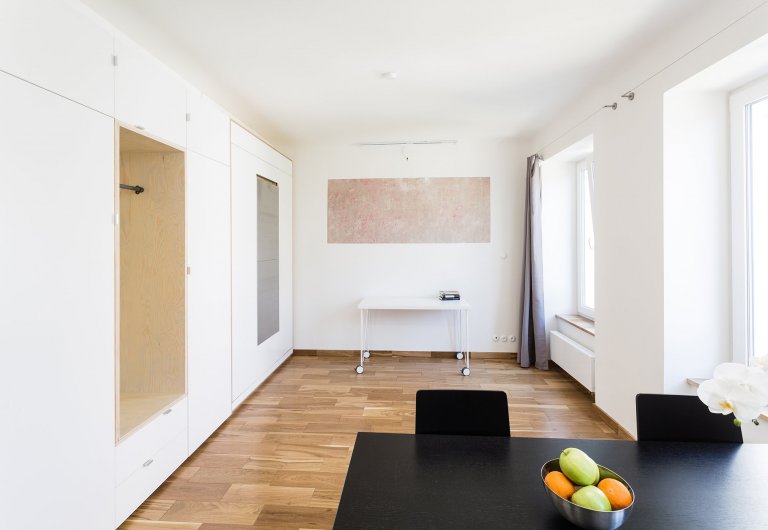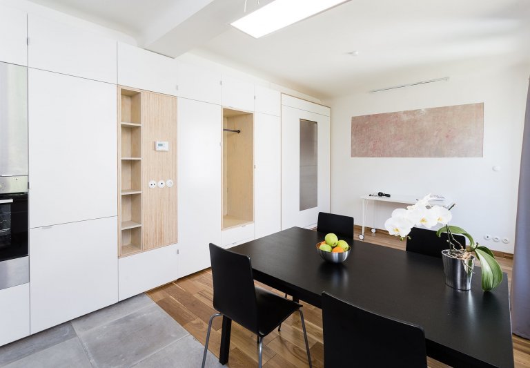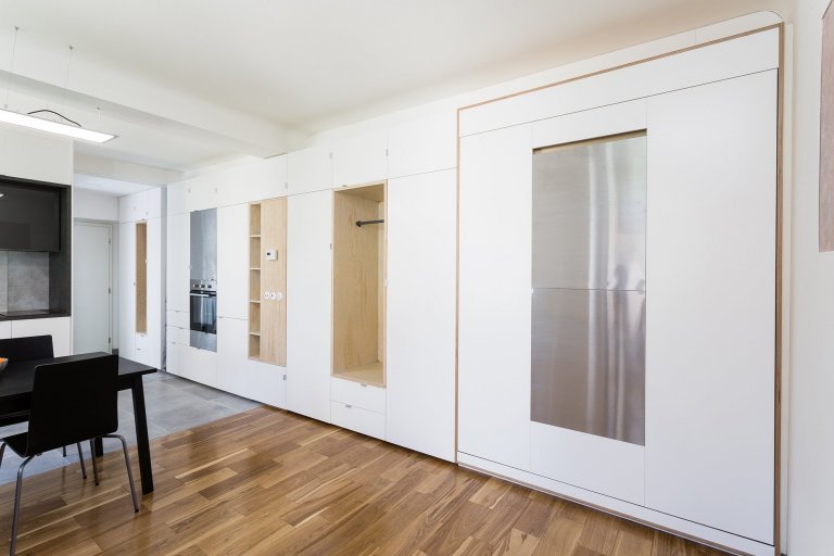 Velmi praktická je pak skládací postel umístěná taktéž do úložné stěny. Díky tomu pak v bytě vzniká i prostor pro posezení s přáteli u stolu bez pocitu stísněnosti. Dostatek světla je v bytě zajištěn velkými okny. Kuchyňský kout s předsíní a koupelnou je opticky rozdělen odlišnou podlahovou krytinou. V místech častého kontaktu s vodou je totiž velmi prakticky zvolena dlažba, kdežto v prostoru obývacího pokoje či ložnice je podlaha dřevěná, která přece jen působí mnohem útulněji. Úsporným řešením je použití minima nábytku a vybavení z cenově dostupných řetězců s nábytkem. Přesně tyto projekty jsou důkazem, že i na malém prostoru lze po větší nebo menší rekonstrukci vytvořit místo, které pro bydlení jednoduše stačí, a navíc nebude náročné na údržbu, ani na úklid.