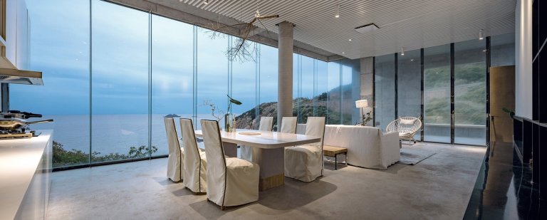 Při výběru materiálů se architekti drželi u těch klasičtějších. Patří mezi ně dřevo, kámen, ale také beton, který má tu výhodu, že není korozivní, což je v tomto mořském klimatu velmi důležité. Z textilií byla sázkou na jistotu přírodní klasika ve formě lnu a bavlny. Povšimnout si musíme i důmyslnému osvětlení domu, poškozenou střechu totiž nahradila střecha ze skla, která ve dne poskytuje dostatek světla. Celé bydlení se nese v duchu jemných a přírodních barev, které na člověka působí příjemně a útulně.