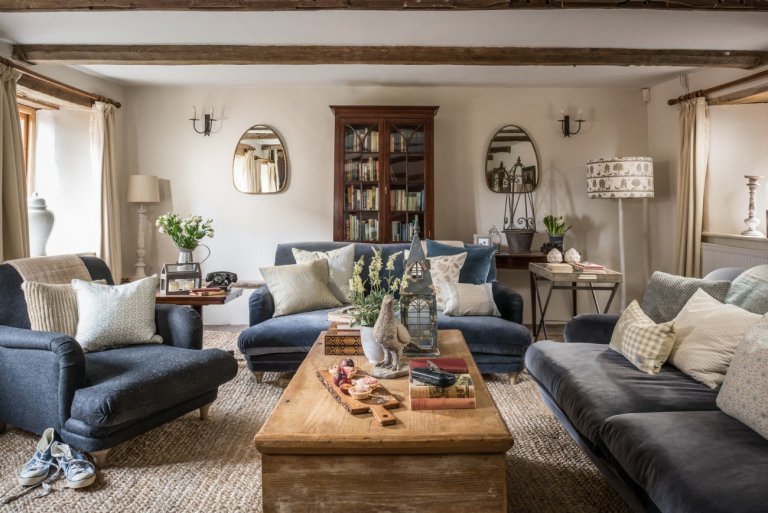 Interiér tohoto velšského domu vyzdvihuje kouzlo venkova a činí tak v koncipování jednotlivých pokojů, charakteru každého doplňku i v tom nejmenším estetickém detailu. Všudypřítomný venkovský styl tak zde zvýrazňují především přiznané trámy ve světlé barvě dřeva, tradiční okna s dřevěnými rámy stejné barvy, dřevěné komody, stoly a skříňky, historické židle, ale také tak půvabně a hojně užité textilie těch nejpříjemnějších vzorů a barev. Útulnost celého interiéru tak pomáhají zajistit romanticky vyvedené závěsy padající mnohdy až na zem z elegantních dřevěných garnyží a s nimi často sladěné ložní prádlo.