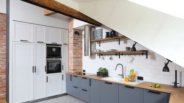 Jak je důležité pro rodinný interiér, kuchyně je plně vybavena a uspořádána v souladu s principy ergonomie.. Návrh nábytku ve tvaru písmene U poskytuje velké množství úložného prostoru, včetně domácích spotřebičů a velkých ploch pracovních desek. Osvětlení zde také hraje dekorativní roli. Pneumatiky položené v celém stropu dokonale zapadají do stylu celého bytu a použití několika dalších světelných zdrojů vytváří ve večerních hodinách tu správnou atmosféru. Podlaha je ze šedých šestihranných dlaždic, které tvoří zajímavý vzorek. Jako poslední nesmíme vynechat ani osvětlení nad konferenčním stolkem v obývacím pokoji, které tvoří několik kabelů se žárovkami.