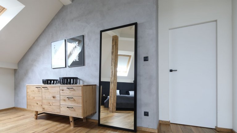 Tento byt se nachází v samém centru Krakova v podkroví starého činžovního domu. V jeho interiéru, který navrhla Katarzyna Walawska, najdeme prvky industriálního a skandinávského stylu. Interiér je moderní, ale ukrývá v sobě i několik starších prvků, které celý interiér zútulní.