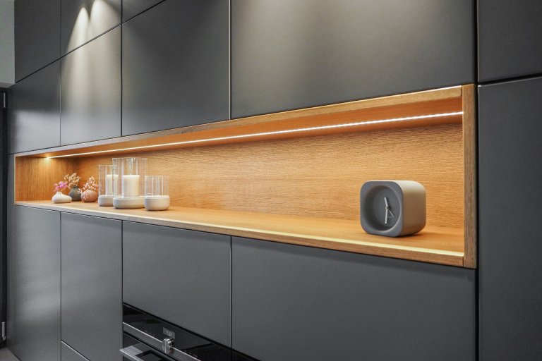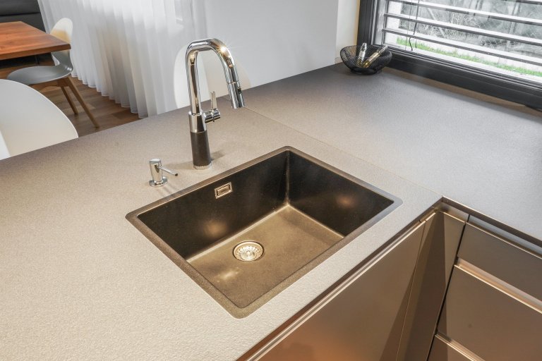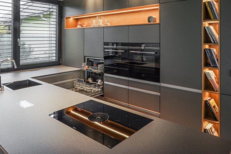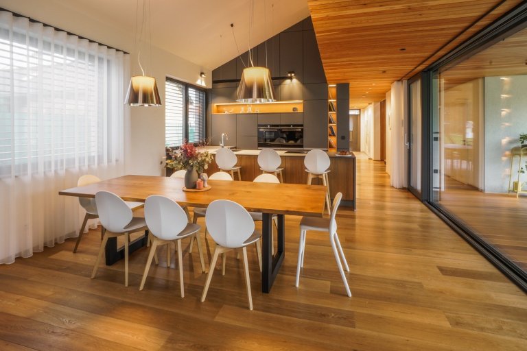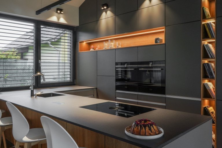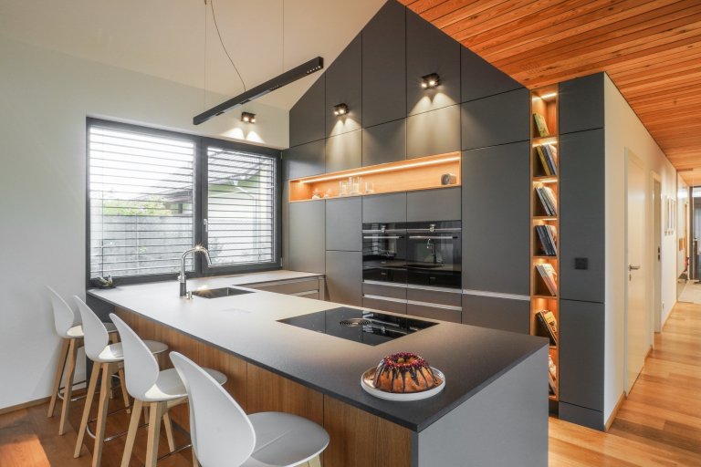V interiéru plném dřeva a velkých výhledů vznikla velkoryse pojatá luxusní kuchyně, která plně odpovídá představám manželského páru. Architektonické studio oslovili ve chvíli, kdy byla postavena hrubá stavba jejich moderního domu. Nyní už se radují z kuchyňského a jídelního prostoru stvořeného přesně na míru.