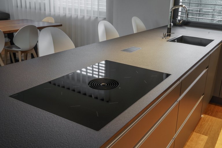 Výslednému vzhledu kuchyně předcházelo společné ladění celé řady detailů. Nejprve však byly zvažovány různé možnosti umístění uspořádání jednotlivých kuchyňských prvků. Prioritou byla praktická stránka kuchyně, takže bylo zapotřebí soustředit se na ideální umístění dřezu, přípravné části a prostoru pro vaření. Ve výsledku zvítězilo řešení, kdy se veškerá práce v kuchyni odehrává směrem k jídelnímu a obývacímu prostoru. Kuchyňský ostrůvek se tak stal místem určeným jak pro přípravu jídel, tak pro mytí nádobí. Pod oknem je navíc umístěna další část pracovní plochy, osvěžená inspirativním výhledem do zahrady. Tato dodatečná pracovní plocha je napojená na úložný prostor v rohu kuchyně, který pak přechází v technický blok. V něm našla místo vyvýšená myčka na nádobí, pečicí trouba, parní trouba, ohřívač talířů a také vestavěná chladnička. Technický blok je ve své horní části doplněn o osvětlení, k dispozici je zde také několik otevřených polic.