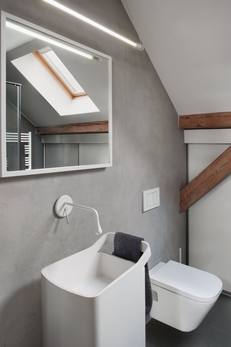 Tomek se rozhodl, že nebude interiér dělit na jednotlivé místnosti. Stejně tak zůstal kompaktní prostor pod střechou. Ačkoli nejsou ložnice oddělené zdmi a dveřmi, najde zde každý svůj intimní prostor. Opticky totiž vše rozdělují krovy a masivní trámy. Majitel si v ložnici splnil svůj velký sen, kterým byla „lázeň pod mraky“. Vanu totiž umístil do prostoru pod střešní okna. Eklektická obří lampa pak dodává pohádkové kouzlo této netradiční a útulné ložnici. Vedle této originální koupelny zde najdete také klasickou koupelnu se sprchovým koutem. Z obývací, kuchyňské a pracovní části v prvním patře se do podkroví dostanete po ocelovém schodišti.