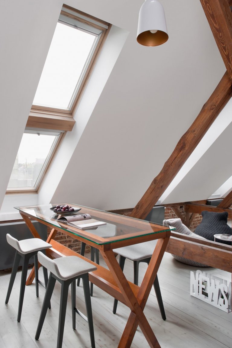 Přímo nad schody je místo pro cvičení s posilovacími stroji a mezi trámovým najdete provazovou síť, která slouží jak k houpání, tak k relaxaci. Byla vyrobena na zakázku a je schopna udržet váhu několika set kilo, takže si zde může lebedit hned několik lidí najednou. A Tomek přiznává, že je to často nejoblíbenější místo návštěv, kde poslouchají hudbu nebo si čtou. Střešní okno přímo nad sítí sem vpouští dostatek denního světla a večer zase nabízí pohled na hvězdnou oblohu. Volný prostor umožňuje být s návštěvníky bytu v neustálém kontaktu. Najdete tu dostatek pohovek, křesel, pufů k posezení u televize nebo u krbu. Protože je majitel milovník hudby, nechybí ani kvalitní audio systém, který pokryje celý prostor bytu. Byt je vpravdě interiérem 21. století, protože stačí zmáčknout tlačítko telefonu a ovládáte osvětlení, klimatizaci, audio systém, nebo spustíte domácí kino. Za tímto skvělým dílem stojí tým mladých designérů z polské Poznani Michalina Majcherkiewicz-Chmielowska a Jędrzej Sobkiewicz. Ve své práci se zabývají především návrhy interiérů domů, bytů, komerčních a veřejných prostranství.