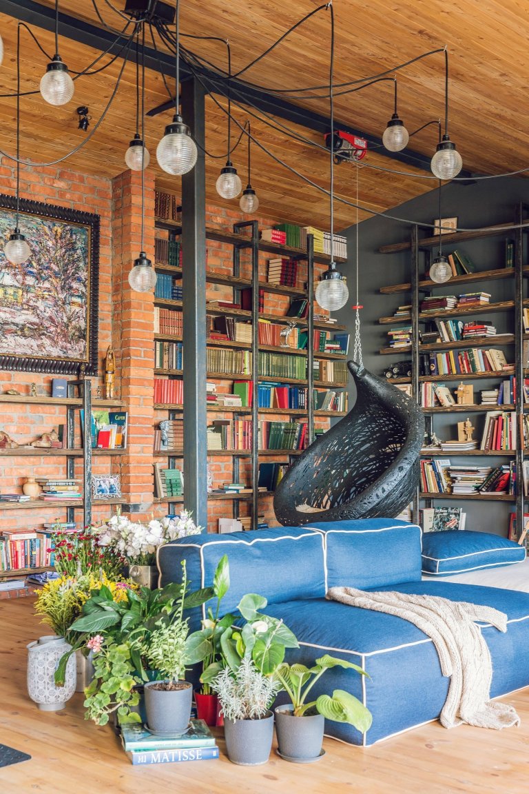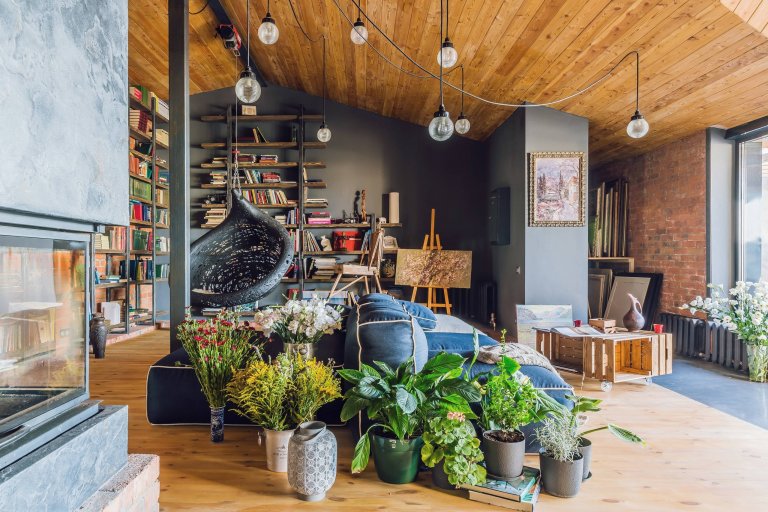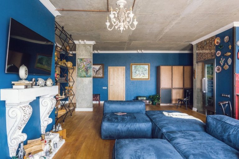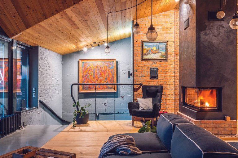 Tento loftový byt byl inspirován dřevem a barvami, spoustou barev. Obojí je pro tento byt charakteristické. První místoností tohoto bytu je prostrorný obývací pokoj, jehož strop pokrývá dřevěné obložení. Na stěnách si můžeme všimnout kombinace šedé barvy se světle oranžovou cihlou, která pokrývá jednu ze stěn. Obě stěny pokrývá velké množství jednoduchých polic, které jsou skvělým prostorem pro všechny knihy i jiné dekorace. Uprostřed se nachází jednoduchý gauč, za kterým je i designové černé křesílko, které je zavěšeno od stropu. Nechybí ani rostliny, které dodají prostoru i trochu od přírody. Tento pokoj na nás může působit poměrně chaoticky, ale zároveň si musíme povšimnout, že vše, co vidíme, má své místo. Originální je určitě stropní osvětlení, které je tvořeno z kabelů, které visí od stropu dolů - konec tvoří koule, které kryjí žárovky. Celou místnost zakončuje krb, který se v Rusku určitě hodí. Světlo do obývacího pokoje proudí velkým oknem, které umožňuje výhled na okolí.