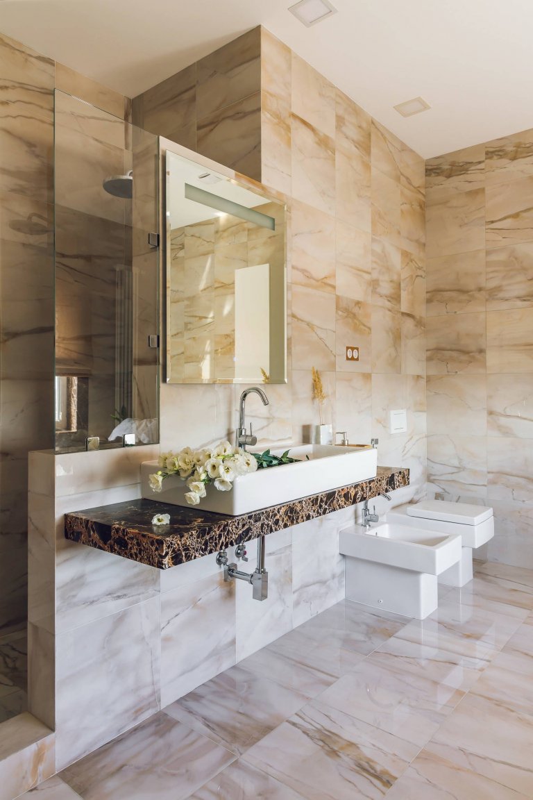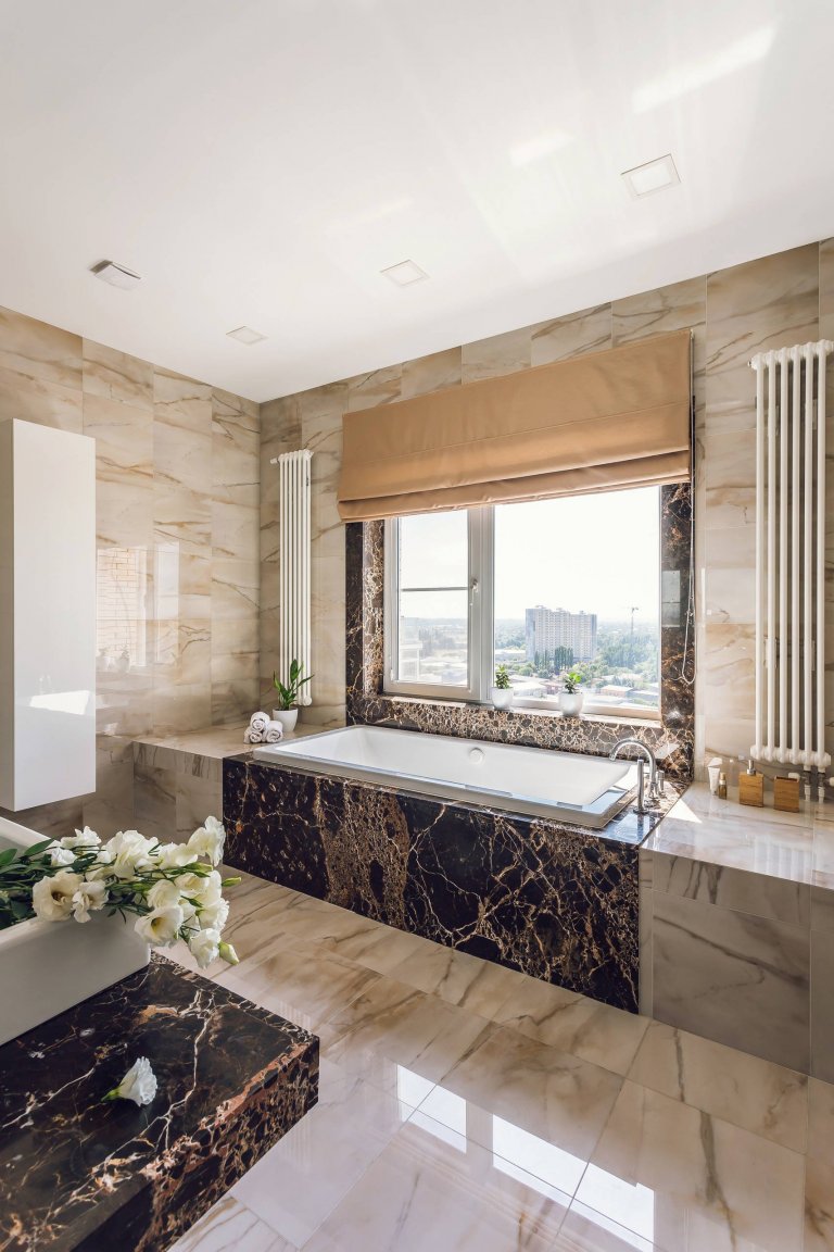 Koupelna je oproti zbytku loftu poměrně jednoduchá. Zdobí ji kombinace světlých a tmavých vzorovaných obkladů, které doplňuje sanitární zařízení s rovnými liniemy tak, jako umyvadlo se zrcadlem. Za menší stěnou je schován sprchový kout, naproti vana, u které je okno s výhledem ven, soukromí je zajištěno díky výšce bytu.