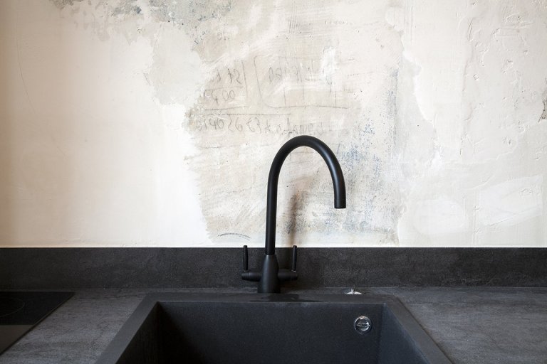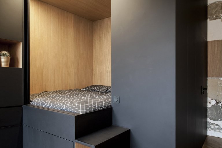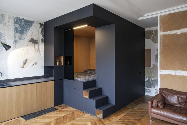 Důkaz, že i na pouhých 32 m2 se dá vytvořit luxusní interiér. Nádherně surová patina na zdech působí jako umělecká díla. Autorem je francouzské Batiik Studio.