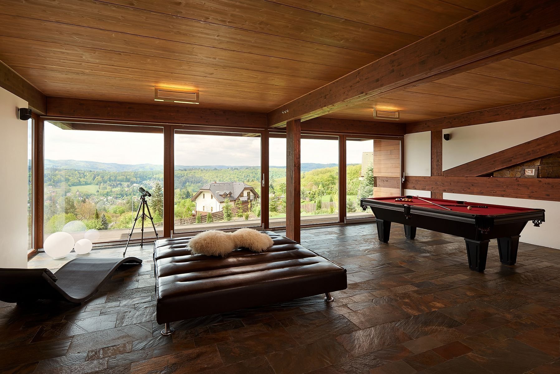 Dotek přírody je v interiéru patrný rovněž díky převaze zemitých barev. Odstíny hnědé a šedé barvy sem tam rozbíjejí akcenty béžové, bílé, červené, černé a zlaté barvy. Díky této kombinaci barev působí interiér kompaktním dojmem bez jakýchkoliv rušivých prvků. Opravdovou potěchou pro oko je prostorná koupelna, v níž se dostává ke slovu kombinace světlých barev a materiálů. Spolu s nadčasovým designem tak zde vzniká opravdu luxusní místo k odpočinku. K tomu svádí i relaxační pokoj ve vyšším podlaží, ve kterém je možné zahrát si kulečník, sledovat pomocí dalekohledu nejkrásnější výhledy do krajiny, anebo si jen tak užívat klidu a pohodlí na prostorné pohovce či lehátku. Mimo terasu má tato luxusní vila také balkón, na který lze vejít právě z relaxačního pokoje.