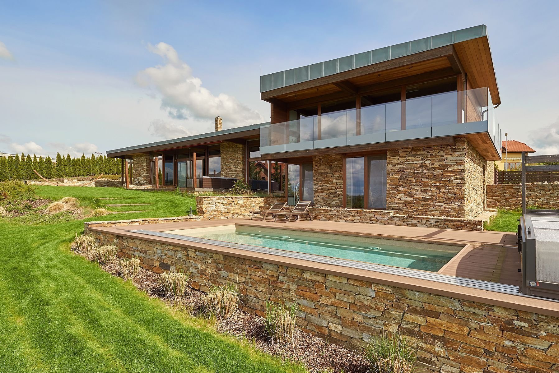Vila situovaná v poklidné lokalitě vysoko nad pravým břehem řeky Sázavy je velice moderní, přesto svým vzhledem plynule navazuje na okolní prostředí. Vděčí za to převaze přírodních materiálů využitých v interiéru i v exteriéru. Luxusní bydlení s důrazem na kvalitní materiály tak představuje například velkoformátová dlažba z přírodní břidlice, mramorové obklady a dlažba v koupelně, kuchyňská linka s žulovou deskou či dubová okna s dvojskly. Hlavní roli v interiéru však hraje propojení břidlice a dřeva, které celek příjemně prohřívá a ještě mu dodává na osobitosti a přírodním rázu. Podobný charakter má i exteriér, který je odlehčen velkými skleněnými plochami. Také moderně pojatá zahrada přirozeně navazuje na okolní přírodu a výjimkou není ani bazén přístupný z prakticky řešené terasy.
