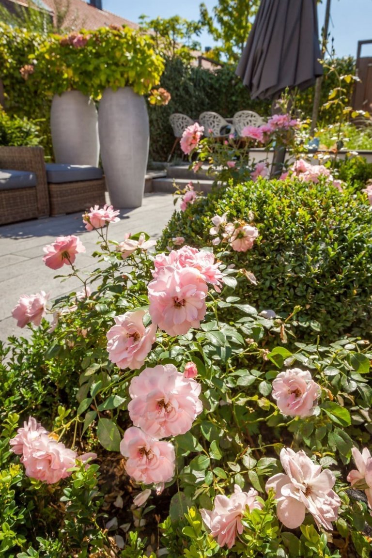 V zahradě je všeho využito s vytříbeným citem. Platí to pro elegantní zahradní stůl s kovovým klenutím nohou, pro nezvykle vysoké květináče i půvabné lucerny. O romantický nádech zahrady se tu rovněž stará střídmě vyžitý trávník, který dostává prostor výhradně po boku růží. Díky absenci převahy jednolité plochy získává zahrada na jedinečné kráse, která tkví právě v její rozmanitosti. Různorodé keře, stromy, květiny a vzrostlé traviny lemují protáhlou terasu, jejíž jednolitost osvěžují plochy z kamene.