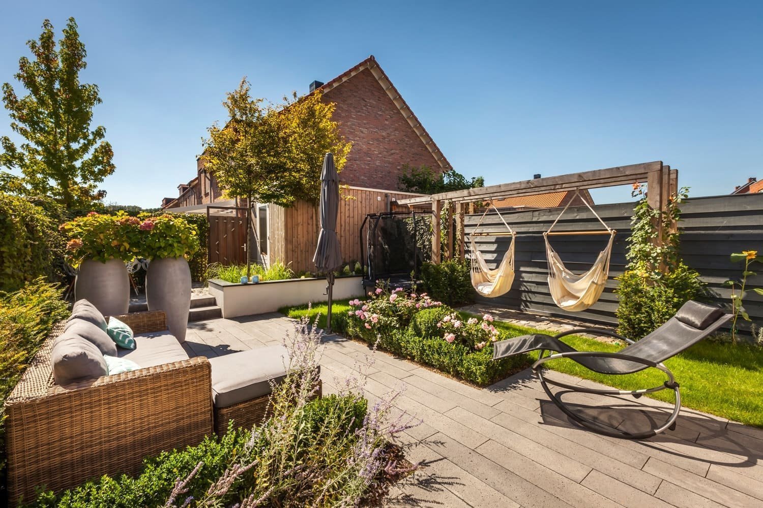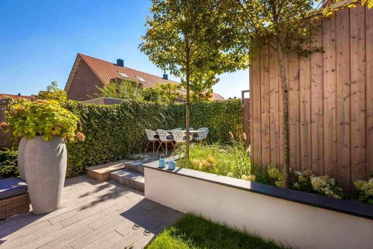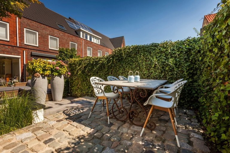 Dům věrný tradiční holandské architektuře dává kráse romanticky pojaté zahrady o to více vyniknout. Obnažené cihly fasády příjemně korespondují s přírodními materiály v zahradě a dodávají tak celku ničím nerušený kompaktní vzhled. Příjemné útočiště opásané živými ploty z břečťanu skýtá ideální prostor k odpočinku, ve kterém je dostatek soukromí pro každého člena rodiny.