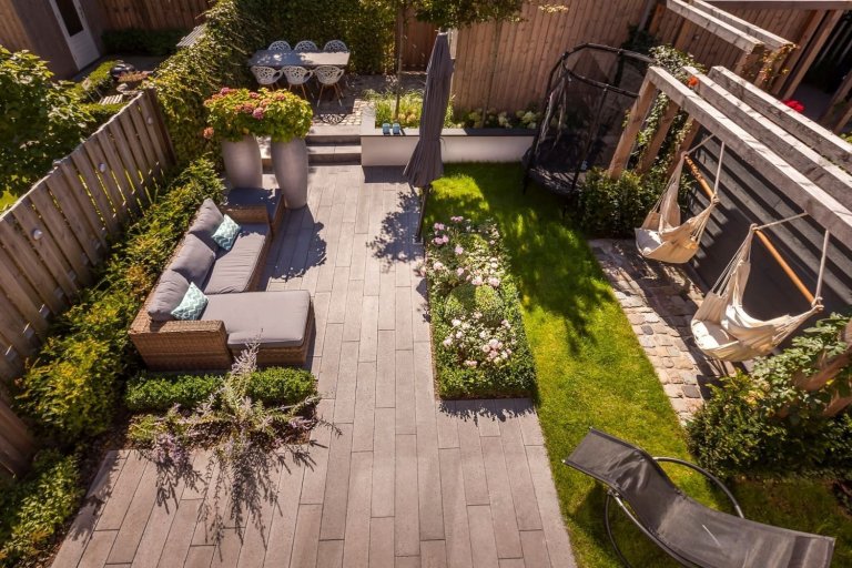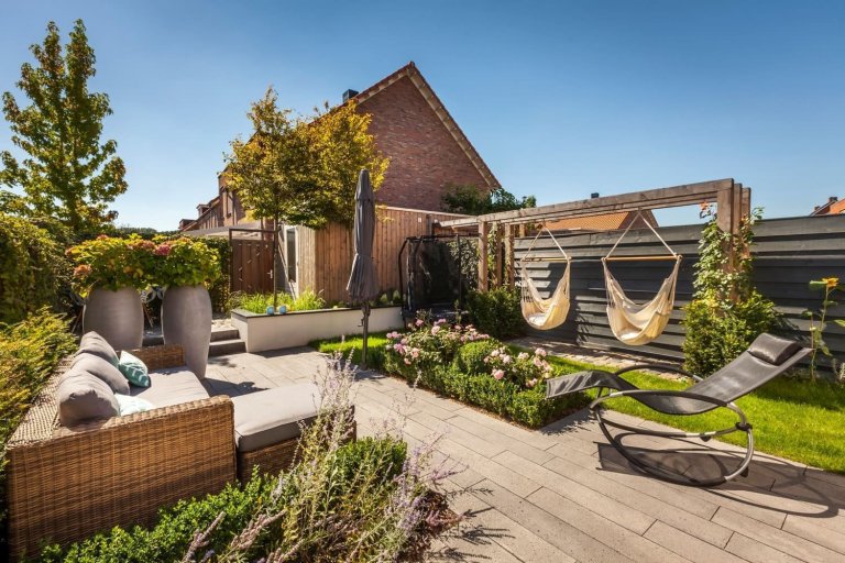 Zahrada je koncipována tak, aby poskytovala prostor plný slunce i příjemný stín. Slouží především k odpočinku, kterému se lze oddávat na židlích u jídelního stolu, na komfortní sedací soupravě či neméně pohodlných lehátkách. Příjemný závan exotiky sem přinášejí i dvě zavěšené hamaky. Jednotlivé odpočinkové zóny od sebe oddělují vyvýšené pásy různorodých květin, které tak zahradu rozdělují, ale zároveň stylově propojují. O příjemný odpočinek zbavený nežádoucích pohledů ze sousedství se vedle velkého slunečníku a vzrostlých stromů stará i vysoký plot, který opět odkazuje na lásku majitelů k přírodním materiálům.