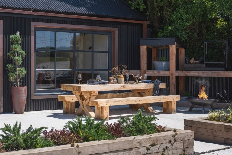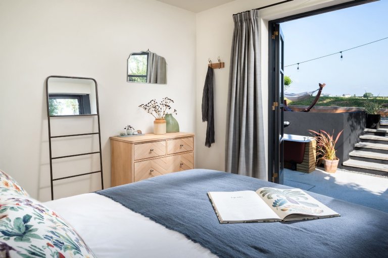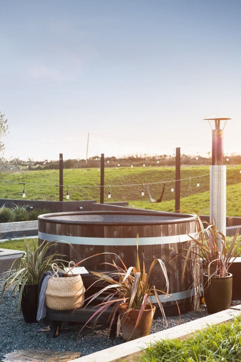 Zajímavým osvěžením domku je venkovní koupelna na terase, kterou spoludotváří volně stojící rustikální vana a sprcha. Díky zídce lemující tento fantastický prostor je zde dostatek soukromí a dokonalý požitek je tak na dosah. Vstoupit se sem totiž dá přímo z ložnice. Po koupeli je možné ulehnout do houpací sítě vzdálené pár schůdků od vany a užívat si výhledů na modré nebe.