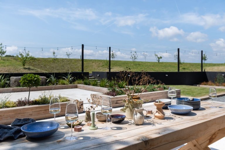 Po šikmé střeše steče všechna voda. Ubrání se větru, dešti i krupobití. Je z černého vlnitého plechu, který si architekt natolik oblíbil, že jej použil také na obklad domu a kuchyni na terase. Dramatický ráz a poněkud strohý dojem černého plechu zjemňuje hřejivý dotek masivního dřeva. To se objevuje jak v exteriéru, tak v interiéru.
