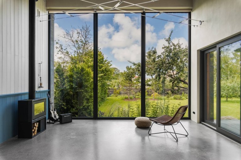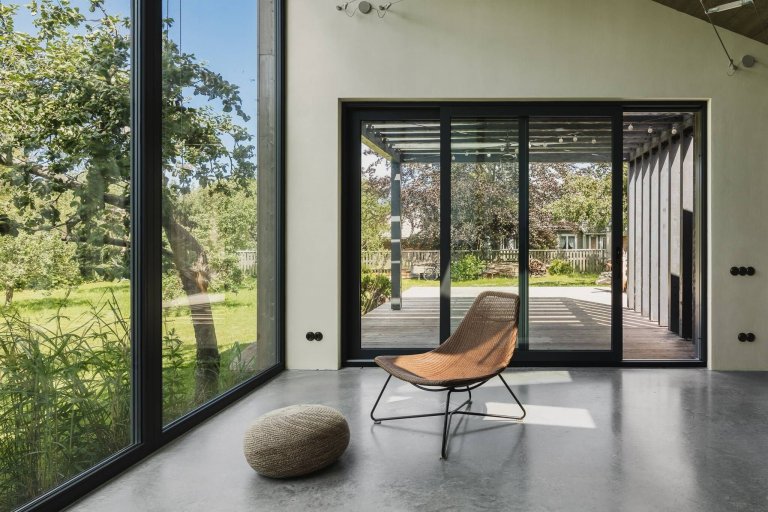 Dům byl navržen jako prefabrikovaná dřevostavba. Celý rám byl postaven mimo staveniště, a tak byla zachráněna stará zahrada s ovocným sadem. Vzrostlé jabloně pak doplnily další stromy, rostliny a keře. Dům od zahrady zároveň spojuje i odděluje terasa s moderní pergolou. V zadní části zahrady se nachází kůlna sloužící k uložení palivového dřeva. Všechny jednotlivé prvky tvoří jeden vizuálně čistý komponent. Dům přirozeně vrůstá do zahrady především díky fasádě z modřínového dřeva, které příjemně rozostřuje kontury bydlení uprostřed přírody.