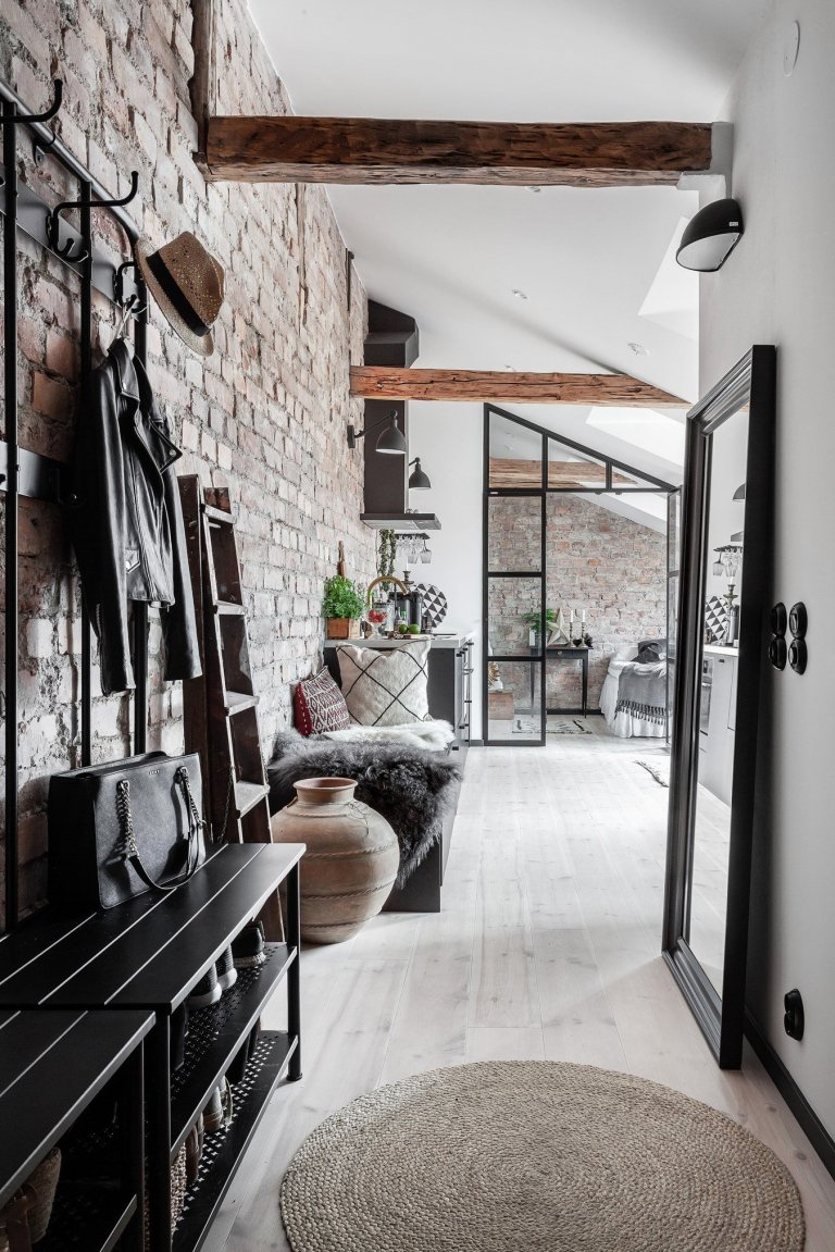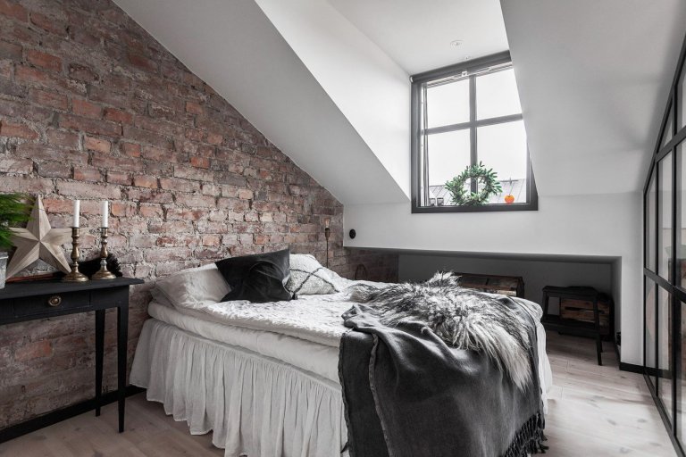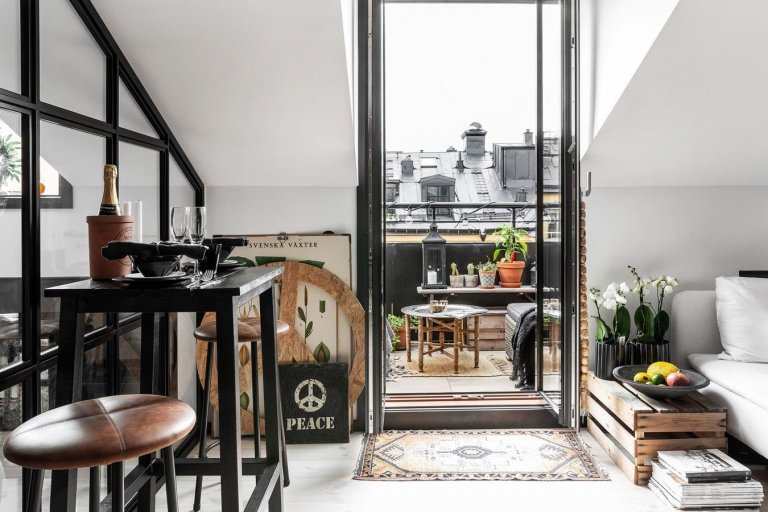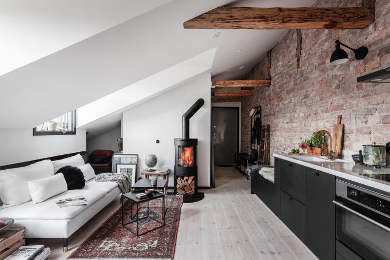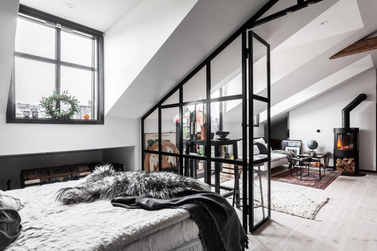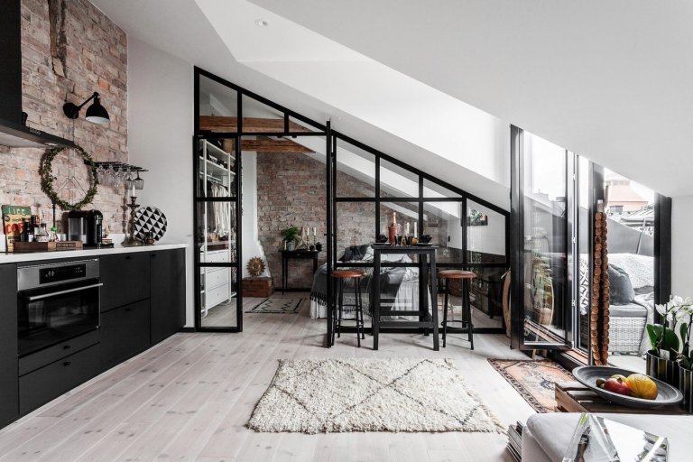 Skvěle řešený malý podkrovní byt ve skandinávském stylu s industriálním nádechem. Nechte se inspirovat hřejivým bytem ve Stockholmu s černou prosklenou stěnou. Uchvátí vás.