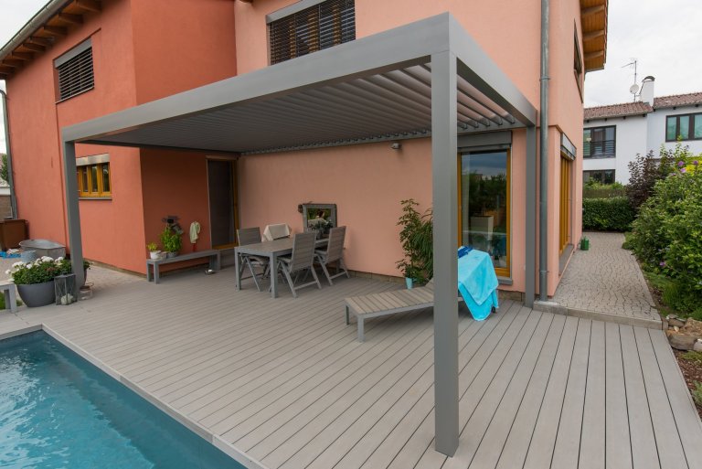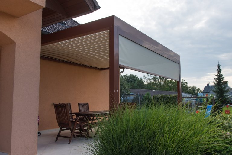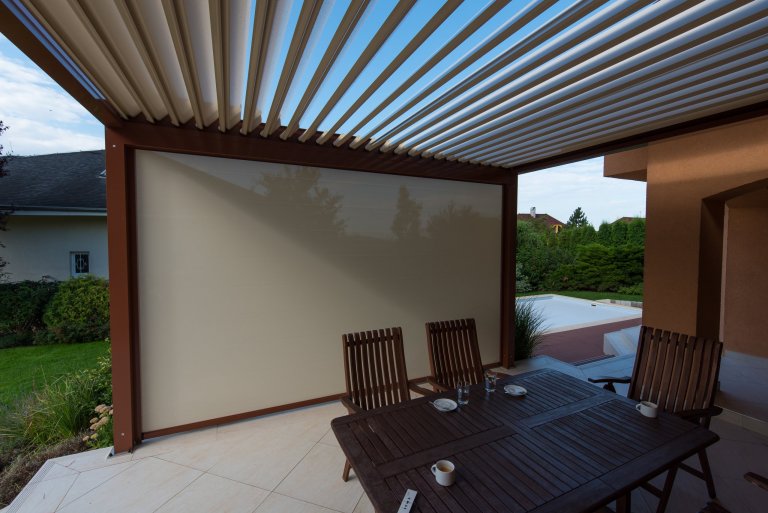 Hliníková pergola disponuje zastřešením tvořeným naklápěcími lamelami, díky čemuž dosahuje nevídané bioklimatické funkce a kompletní voděodolnosti. V parném horku zajistí příjemný proud čistého vzduchu a v případě deště se lamely uzavřou a ochrání Vás i zahradní nábytek. Odtok vody je pak dále integrován skrz nosné stojiny pergoly, aby odpadla veškerá starost. A co sníh? Bioklimatická pergola Meridiem si umí poradit i se sněhovou nadílkou. V případě sněžení se lamely uzavřou obdobně jako u deště a nosnost střechy je konstruována tak, aby překonala zimní čas v našich klimatických podmínkách bez jakýchkoliv problémů.