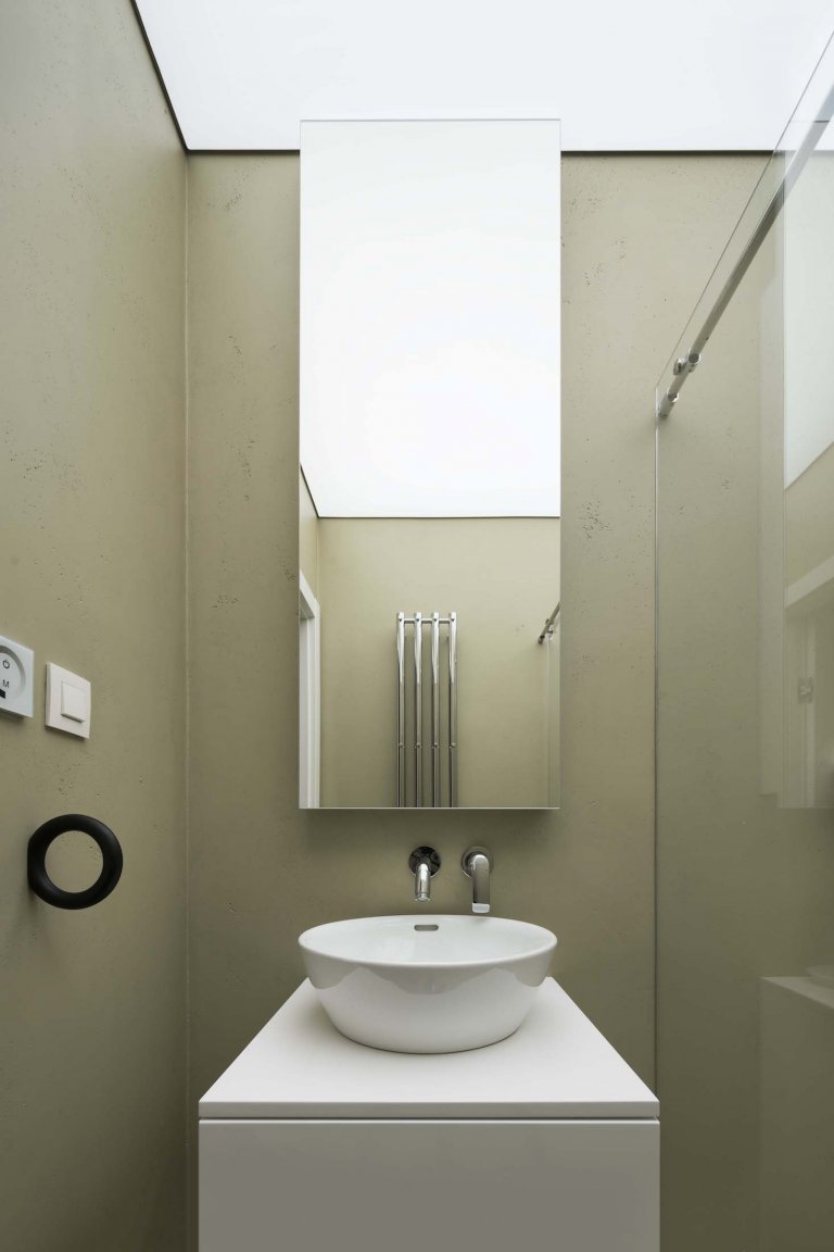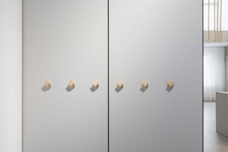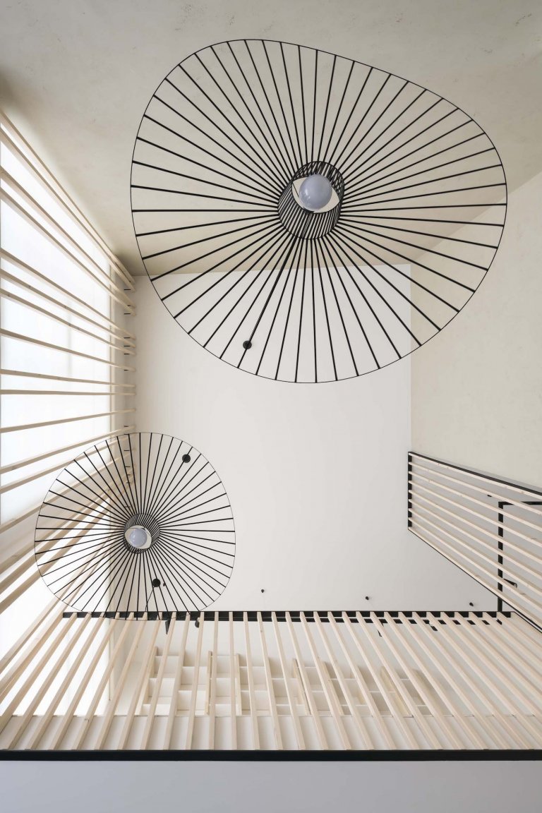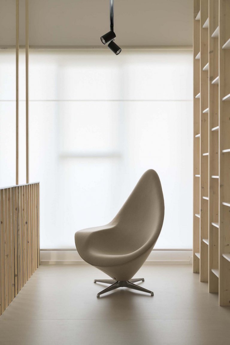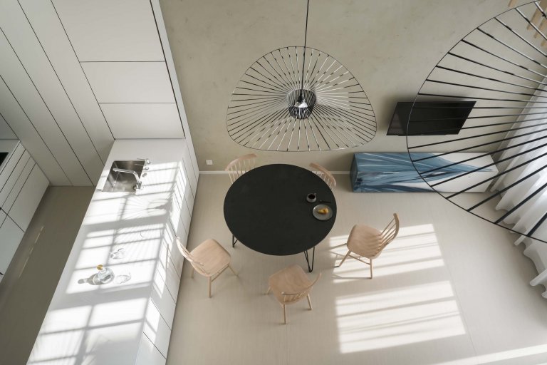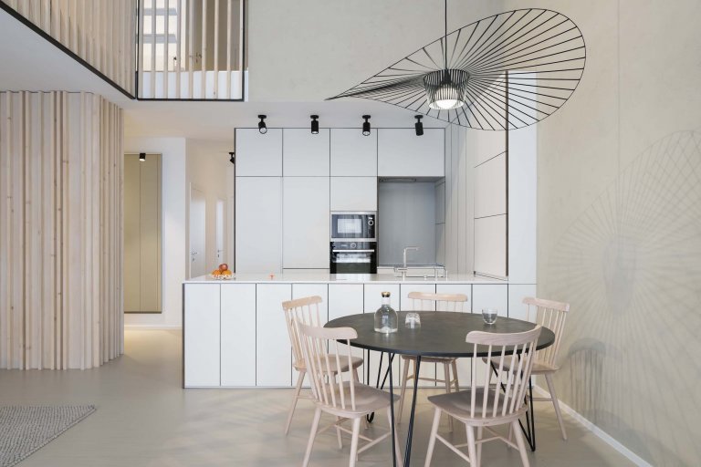 Svislé smrkové latě použity jako dekor, zábradlí nebo obklad, umocňují výšku mezonetu a vertikalitu kompozice. Blok kuchyňské linky je, stejně jako další úložné prostory, navržený na míru s bezúchytkové zásuvkami a dvířky na magnet. Cílem bylo dosažení monochromatického plochy členěné pouze linkami spár.