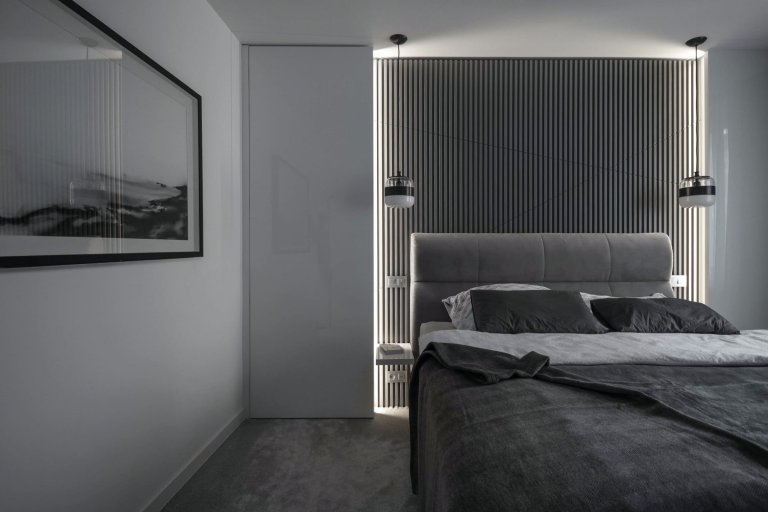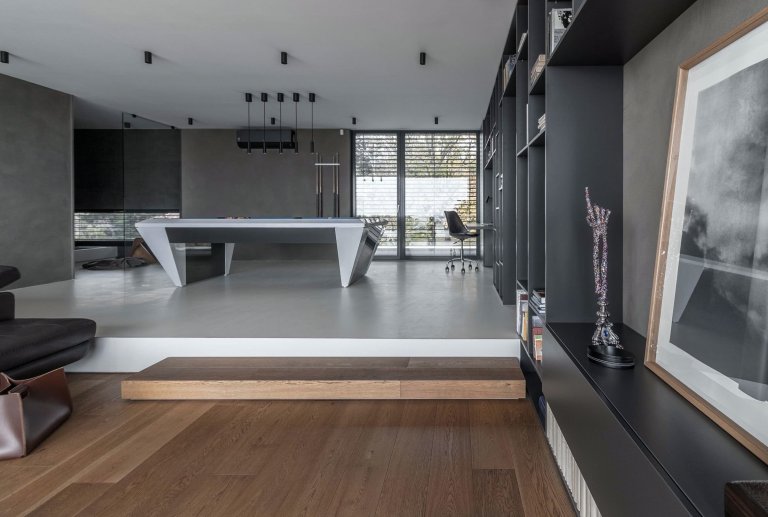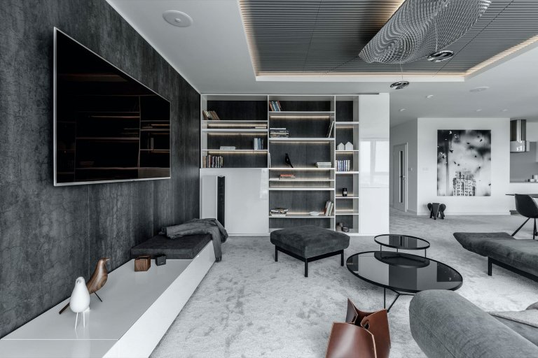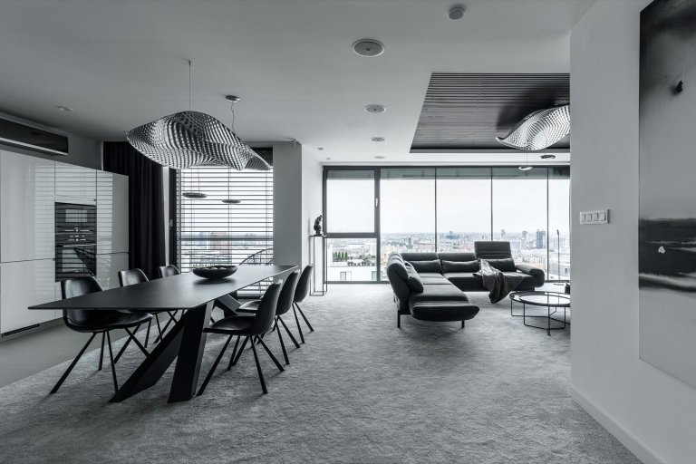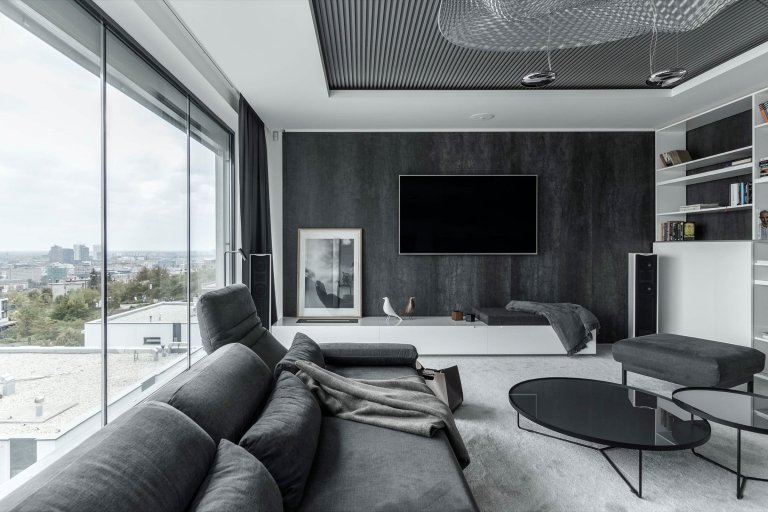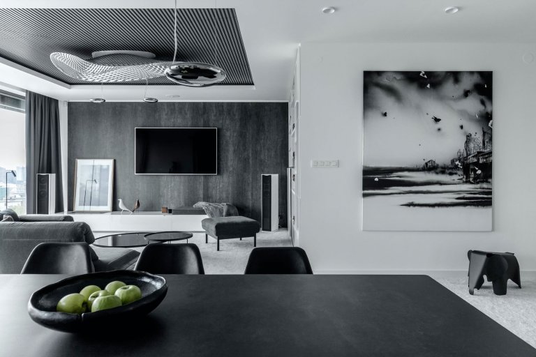 Projekt záměrně potlačující barevnost, v němž hraje hlavní prim souhra materiálů a povrchů v šedých odstínech pohltí zejména zastánců jednoduchosti, čistoty a minimalismu. Mezonetový byt se rozkládá na dvou podlažích se samostatnými terasami a podlažní plochou činícím až 290 metrů čtverečních.