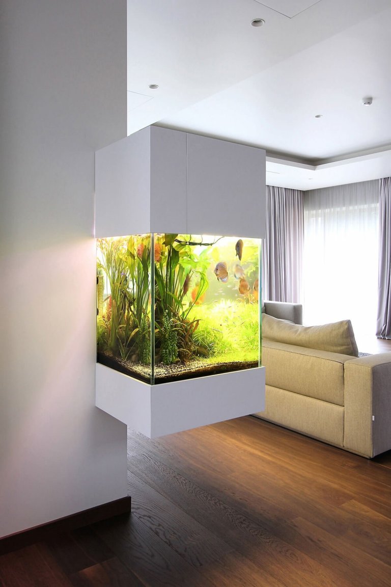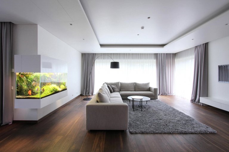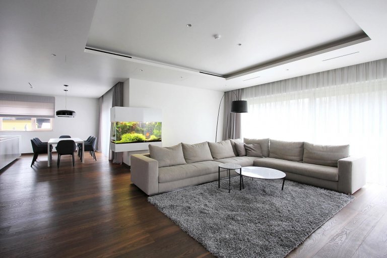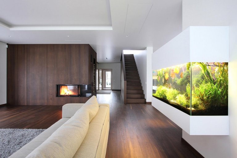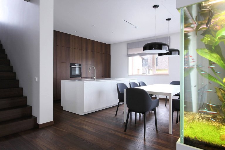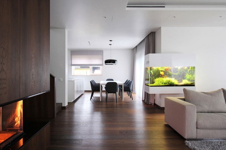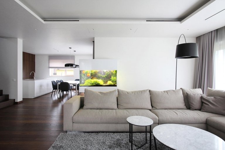 Decentní styl tohoto bytu je v prvním patře příjemně narušen přítomností moderně vyvedeného akvária, které dodává interiéru barvy, život a energii. Podporuje navíc maximálně útulnou atmosféru v místnosti. Akvárium je umně zasazené k bílé stěně a pozorovat život v něm je možné hned z několika stran. Přináší tak do bytu kus přírody, která svou zelení rozsvěcuje jinak decentně laděný interiér. Ve druhém patře se totiž klasický styl v černo-šedo-bílé barvě opakuje a vytváří tak nepřetržitý charakter celého bytu.
