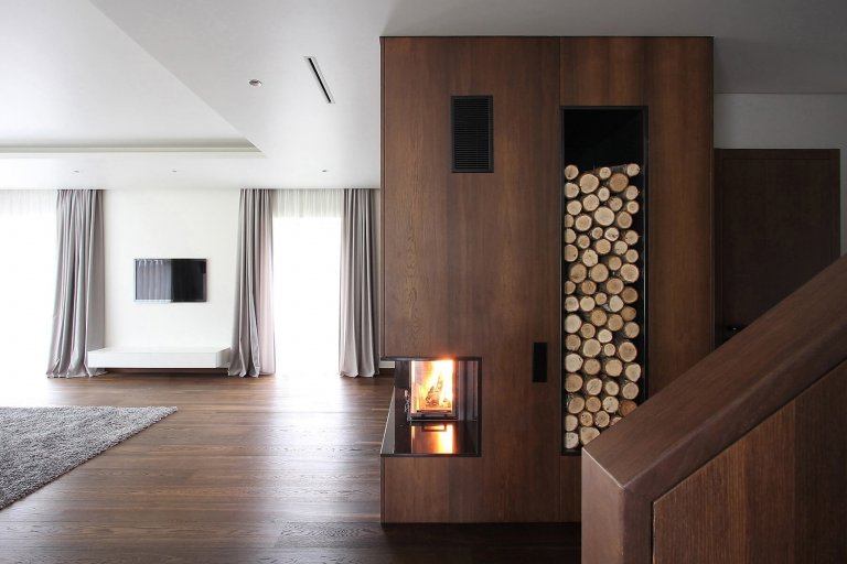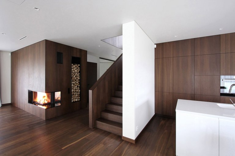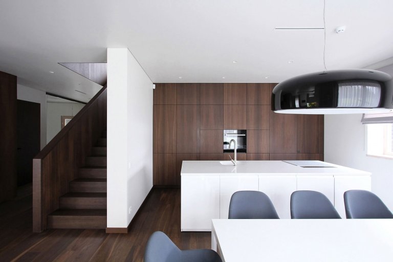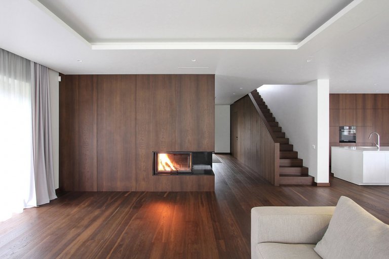 Interiéru dominuje na pohled velmi příjemná a přirozená barva dubových podlah, která se místy odráží i do obložení na stěně. Dřevěné obklady působí hřejivým dojmem jak v případě kuchyňské linky, tak v případě vestavěného krbu. O to víc pak tyto tmavé dřevité tóny dávají vyniknout bělostným stěnám a stejně bělostnému nábytku. Celek pak stylově rozbíjí hravé černé lustry, které jsou opravdu zajímavým designovým prvkem v interiéru.