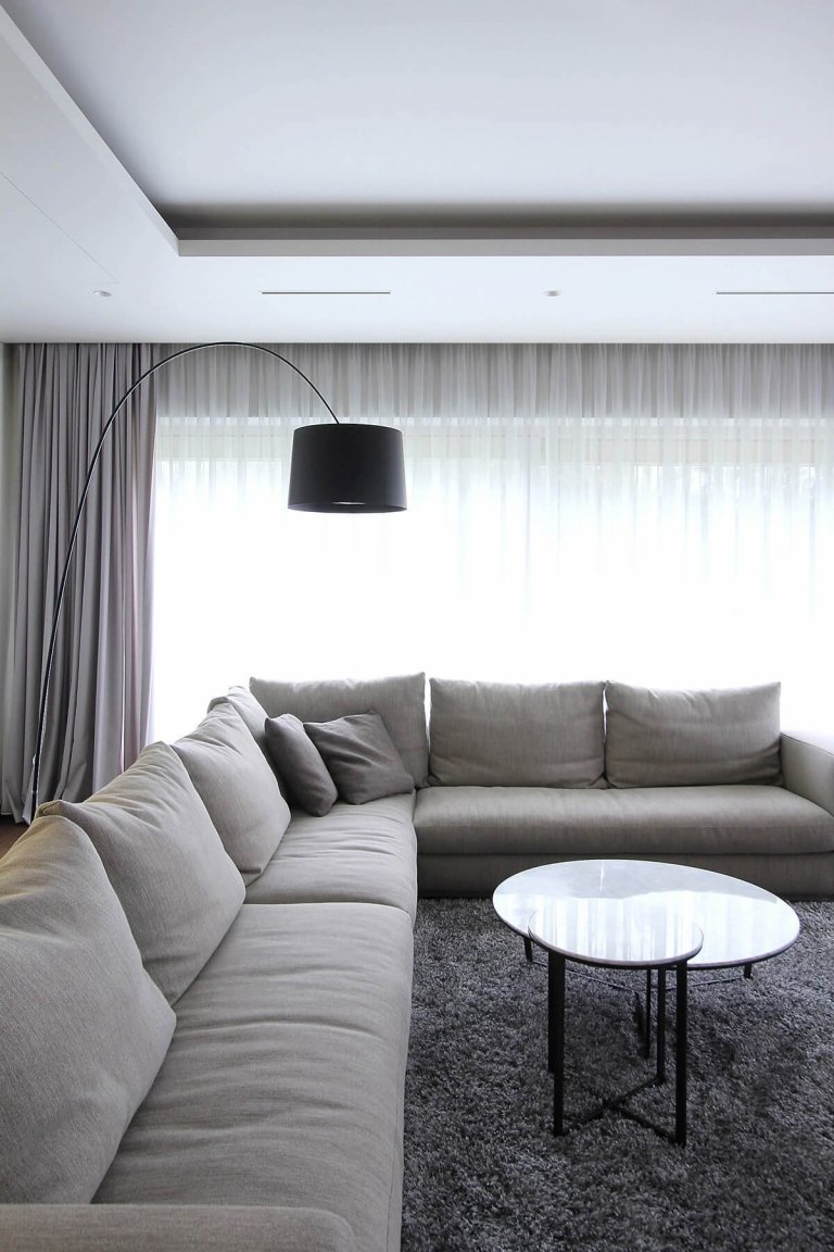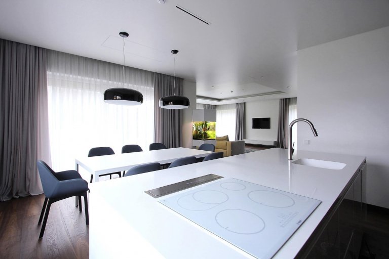 Architekti zde dali naplno vyniknout čistým a jemným liniím, ponechali bytu vzdušnost, a tak mohly vyniknout jeho velkorysé proporce. Světlost interiéru je zvýšená díky řadě velkých oken, ale rovněž díky stěnám a nábytku v bílé barvě, kterým sekundují přítomné černé, šedé a dřevité tóny, čímž vzniká působivý kontrast.